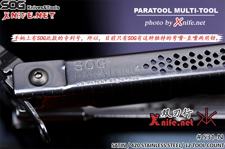 此款SOG #S31-N “PARATOOL” 多角度多用工具钳,是SOG独家专利,并且市面上目前唯一 一款可以调整角度(140°-180°)的工具钳。改款钳子最大的特点就在于,此款的钳头第一个打开位置,是大概40°-45°的弯形钳,可以在狭窄空间,或者是普通钳无法够到的特殊角度下来使用。使用时,通过按压钳头上凸出的按柄,即可打开钳头,然后稍微用力掰开,此时就是一款弯嘴钳,而继续施加力量,则可以将钳头掰直,变成一把普通的直嘴钳。钳头包括三个部位,尖嘴钳,普通钳,和剪切口三个功能,需要注意的是,尖嘴钳位置不可用来大力拧,或者夹断非常非常坚硬的物体,如果需要拧螺丝,请使用普通钳的位置。剪切口经过热处理,但是也不可以用来剪切钢制坚硬的物体,会损伤钳头。 同经典SOG钳子一样,手柄保留了经典的通风孔设计,而两个手柄内侧则隐藏了一些其他功能,包括主刀,锯齿刃刀,一字螺丝刀,十字螺丝刀,开瓶器,开罐器,锥子等等日常最经常用到的功能。随钳子附带一个高级弹道尼龙制作的优质尼龙套,坚固耐用。