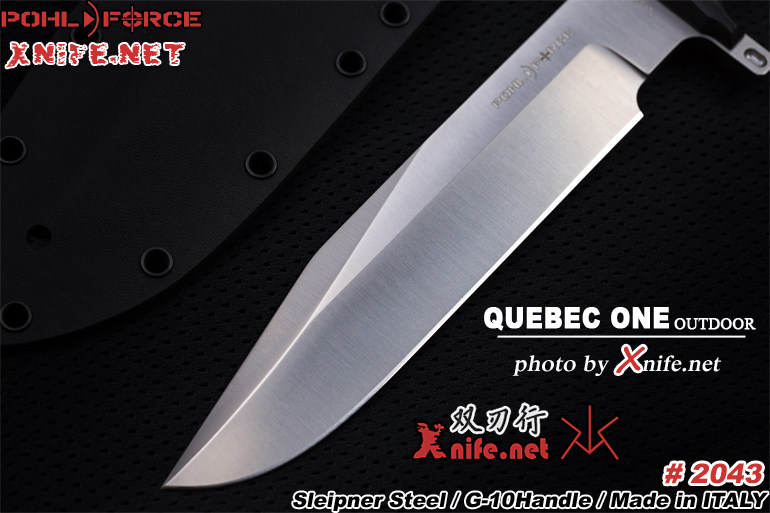 品 牌 POHL FORCE 波尔·武力(德国) 型号 #2043 "QUEBEC ONE - OUTDOOR" EOD北约部队战术直刀 产地 德国品牌,在意大利制造。 全长 315 mm 表面处理 钢本色拉丝处理 切割刃长 193 mm 刀刃钢材 Sleipner 粉末钢 钢材硬度 60-61 HRC 刀刃厚度 5.9 mm 手柄材质 一体龙骨结构,黑色G10包裹。 手柄厚度 24 mm 重量 404 克 官网价格 339 欧元,不包含运费及关税。 刀鞘材质 Kydex ,附带排水孔及腰夹 可选款式 钢本色平刃,另有黑色涂层可选。 限制 未成年人请勿购买任何商品