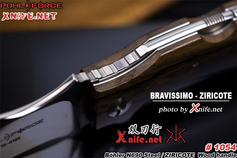 此款波尔·武力#1054 “BRAVISSIMO - ZIRICOTE” “超越-12雄蕊破布木手柄”折刀是POHL FORCE公司在其经典型号“Bravo One ”基础上生产的500支限量版绅士折刀,虽然是绅士折刀,但却属于EOD系列。此款外形和经典的BRAVO ONE一样,但采用更高级的材料和更精致的做工。刀身采用德国百乐公司N690钢制造,表面拉丝抛光处理;手柄采用高级实木 12雄蕊破布木作为手柄,手感舒适细腻;手柄内里有双不锈钢内衬,背部也同样镶嵌有不锈钢材质,所有金属部分,都经过抛光处理;采用背锁结构,手柄末端系有皮绳。随刀附带一个高级翻毛皮皮套收纳。同时,附带一个EOD系列高级收纳包。