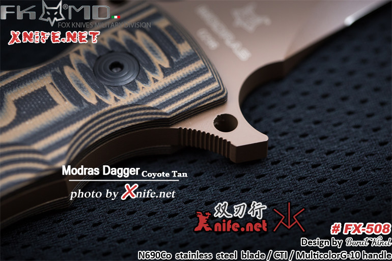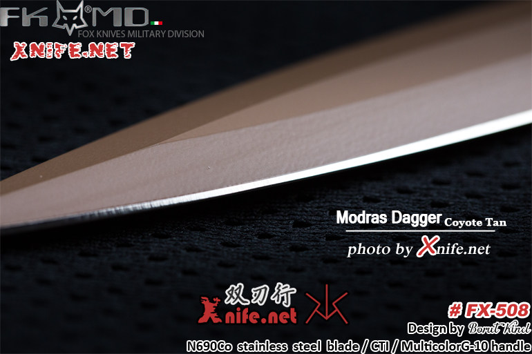此款 FX-508 “MODRAS DAGGER” 双刃剑形格斗刀,是由斯洛文尼亚陆军格斗教官:Borut Kincl 所设计,由FOX生产的一款专业级格斗利器。 DAGGER这个英文单词的大意是具有双刃造型的匕首,短剑;它有别于其他双刃刀的地方是,dagger两侧的刃,几乎是不开刃的,虽然也有开刃,但不是像刀那么锋利,它更看中的是格斗技术,而两侧的刃可以说类似假刃一样,不具有切割能力,但可以辅助提高穿刺能力。 所以,在您购买之前,也就先要了解到,此款的刃,是不能用来切割的。 整“刀”采用N690Co 钴强化版N690不锈钢制作,一体龙骨结构;刀身表面为狼棕色 CTI涂层,也就是类特氟龙涂层。耐腐蚀,耐磨损。 手柄两侧有护手,而手柄则为黑色G-10包裹,提供良好的防滑能力;手柄末端为尖型,格斗时不但可以提高攻击效果,还可以当作破窗器用。 该系列为限量生产,每一支FX-507产品均有一个出厂编号,与皮鞘,包装盒编号相对应。 值得一提的是,该型号一经问世,就引起了很高的反响,并获得了很高的评价,最终在2014年BLADE SHOW美国刀展时,获得了年度刀奖冠军!