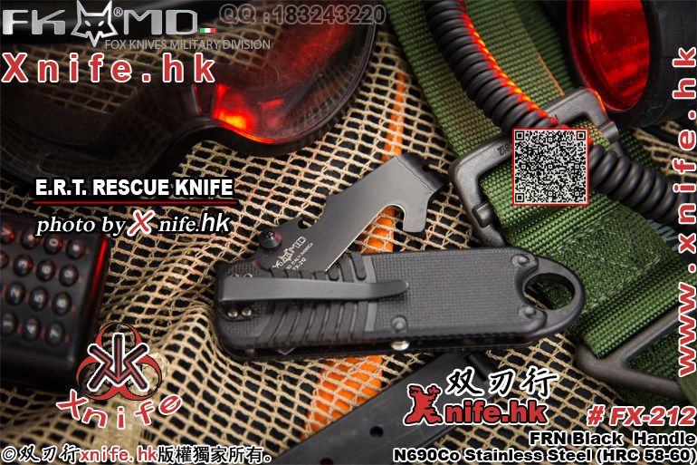 品 牌 FOX 狐狸 (意大利品牌,官网地址:www.fkmdknives.com) 型 号 # FX-212 "E.R.T. RESCUE KNIFE” E.R.T 多功能求生救援工具折刀 产 地 MADE IN ITALY 意大利 制造 全 长 20 cm 刃 长 7.5 cm 闭合长度 12.5 cm 材 质 N690Co stainless steel 钴强化N690不锈钢 钢材硬度 58-60 HRC 刃 厚 5 mm 表面处理 Black Idroglider 黑色专利BI涂层 手柄材质 FRN black Handle FRN(玻璃尼龙纤维)手柄 重 量 175 克 锁定方式 LINER LOCK 内衬锁 功能数量 十字螺丝刀/一字螺丝刀/破窗器/切割器/开瓶器/撬棍/起钉器 等功能 刀鞘材质 NYLON reinforced fiberglass 玻璃纤维增强尼龙浇筑硬鞘,附带MOLLE系统 销售限制 未成年人请勿购买任何商品。