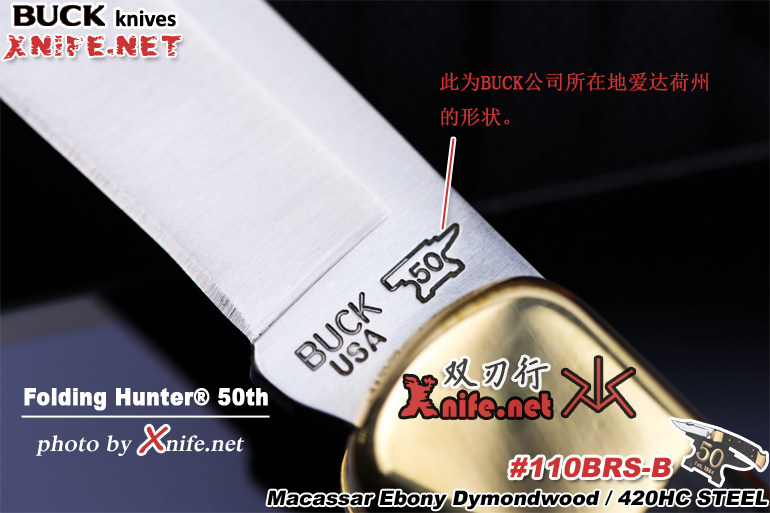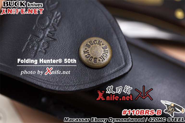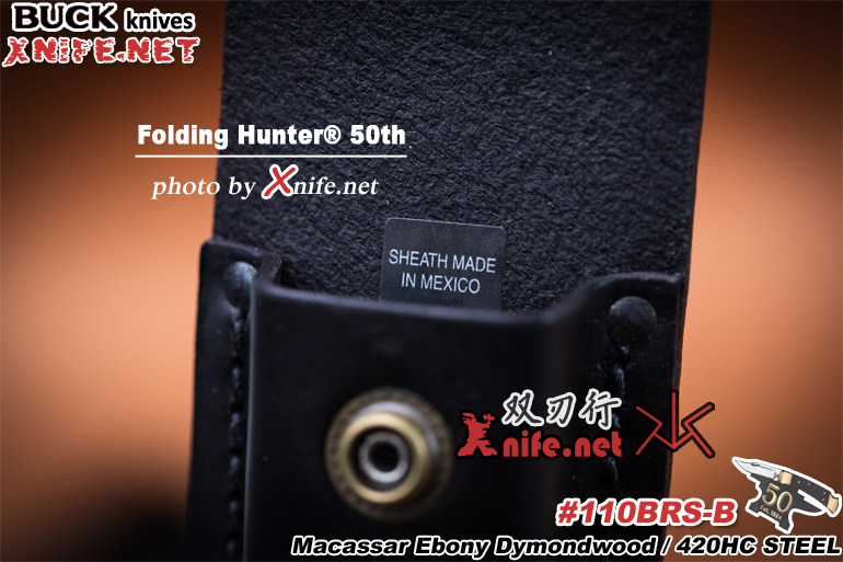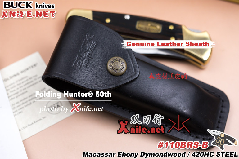 此款刀刃上刻有巴克刀具的创始地 IDAHO 爱达荷州的图案,在图案里刻有50字样,取代了2013年生产的刻有110字样。刀刃部分采用420HC钢制造,手柄采用黑檀木配合黄铜材质,分量十足。配合墨西哥制造的皮套,十分具有典雅绅士气息。