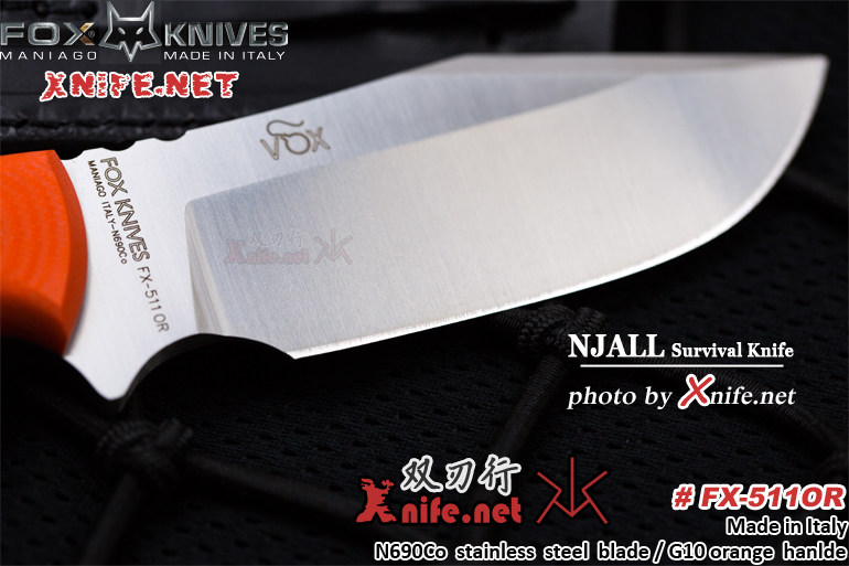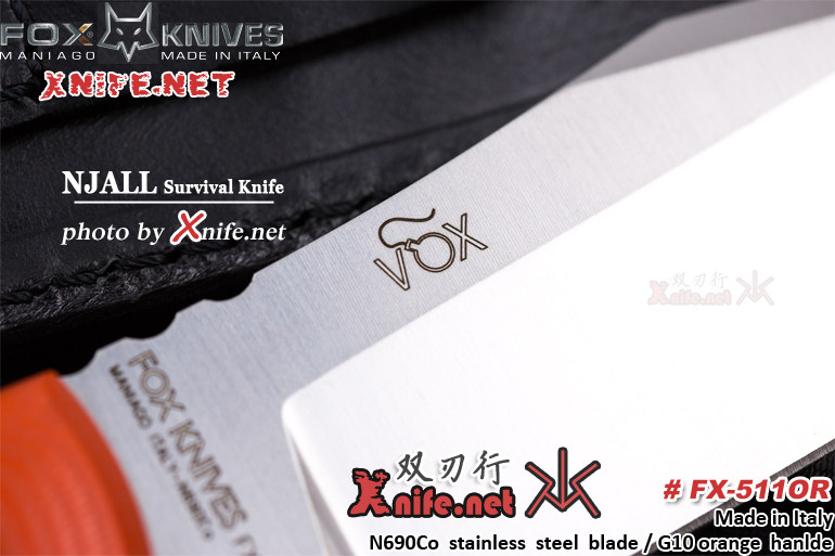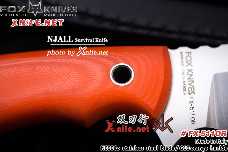 此款FOX 511OR “ NJALL ” 生存直刀,是FOX公司与著名的刀具设计师 VOX合作设计生产的一款面向专业户外爱好者而开发的强悍的生存刀,设计之初的目的就是设计一款坚固,强悍的生存刀。不但可以野外用,借助于N690CO钢材优异的耐腐蚀性,还可以当作潜水刀用。而511OR这个名字,也是象征着该刀的强悍:在户外登山运动中,5.0级别是最简单的,5.10是稍微有点难度的,而5.11级别被认为是不可逾越的,所以,此款刀具命名为511OR,象征着即便在最艰难的情况下,该刀也可以陪伴使用者安然度过;整刀由高达5毫米厚的N690Co不锈钢制造,一体龙骨结构,仅仅是看到这两个数据就已经知道此款是非常坚固的生存刀;刀身表面为钢本色拉丝处理,亮面的刀身会反射光线,如果使用者在野外需要救援,只要将刀身部分对准太阳,利用反射光向救援人员发出信号即可,起到镜子的作用;手柄特别设计为桔色,因为桔色的物体非常容易被发现,一旦刀具意外掉落在野外碎石,或者荒草,植被中,那桔色的手柄非常易于被发现;而当作潜水刀时,桔色是鲨鱼最害怕的颜色,而且在深色环境中也易于被发现;G-10材质是制作手柄最常用的型号,它简单,耐腐蚀,耐潮湿,轻量,坚固;在手柄上还特别设计有两个圆孔,通过伞绳穿过这两个 圆孔,即可将刀身绑定在长木棍上,组成一把长矛,这样在野外不但可以猎捕大型动物,还可以提高攻击范围。 随刀附带一个高级皮鞘,易于携带和拔出。 皮鞘同样在意大利制造!