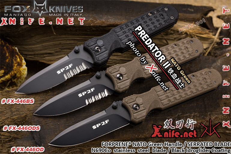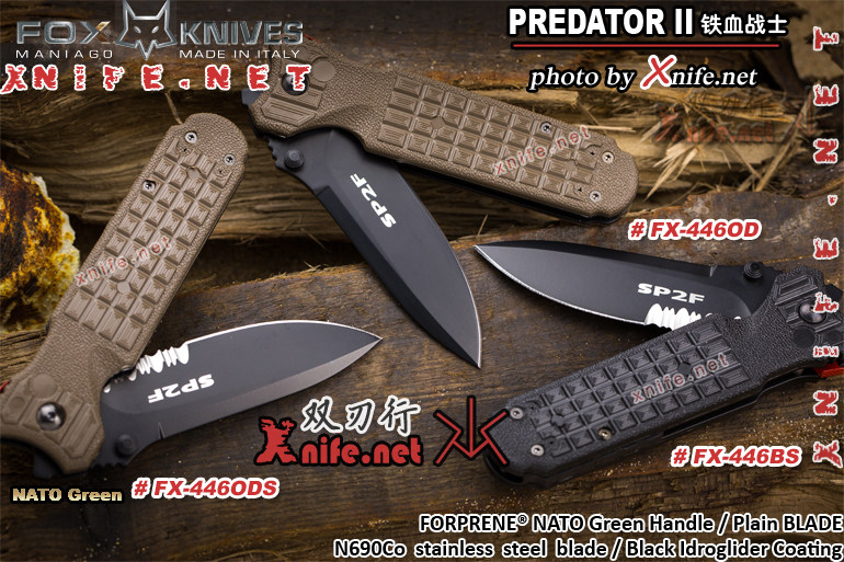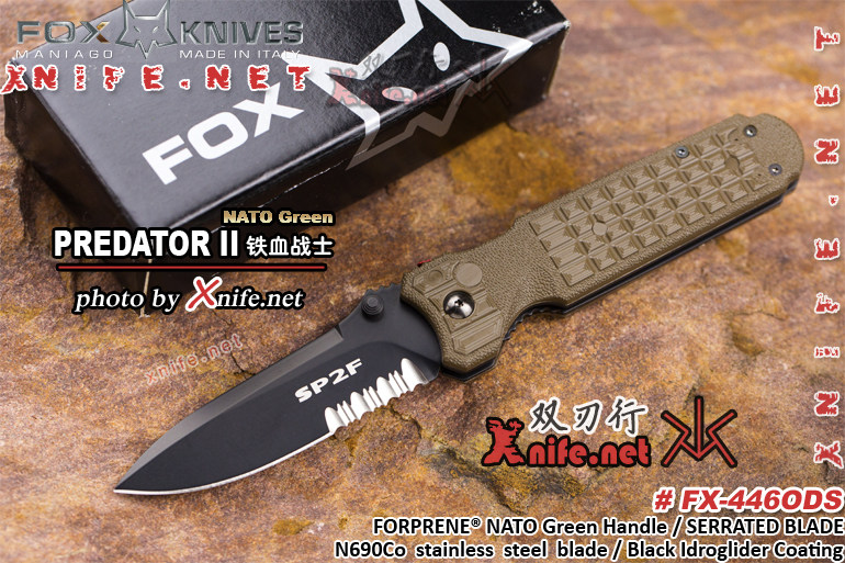 此款FOX 446OD “PREDATOR II” ,因为著名的电影《异形大战铁血战士》而成名。FOX铁血战士的名声太大了!哪把刀能够在短短十年销量超过10亿支?也许只有它。FOX铁血战士被美国Blade《刀锋》杂志选为21世纪最具代表性的10把名刀之一.这把刀可以胜任各种复杂环境,锋利无比。体积小巧,携带方便。作为一款原产意大利的刀,其做工精美,用钢上乘,经过近100道工序锻造而成。 “铁血战士”II代折刀采用非常著名的N690Co 钴强化版N690不锈钢制造,这种高成本的钢材具有极其优异的硬度,韧性以及高耐腐蚀性,相对其他钢材,性价比出众。刀身线条设计犀利流畅,略显宽大的刀身采用黑色BI涂层处理,达到消除反光,增加耐磨损的性能;所用材质符合北约军规要求;手柄采用北约军规材质FORPRENE® 制造,柔软,防滑,耐腐蚀,手柄颜色为NATO GREEN 北约陆军军规标准消光绿色;在手柄的背部,设计有一个红色按钮,这个红色按钮是折刀的保险,当使用者打开刀身后,拇指会自然向前顶住红色按钮,而红色按钮下部是一个挡片,可以挡住折刀的锁定,起到保险的作用,防止折刀意外收回。