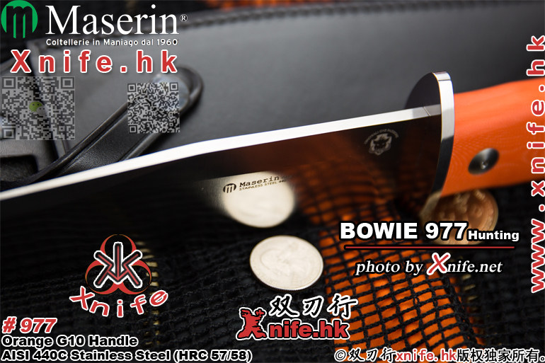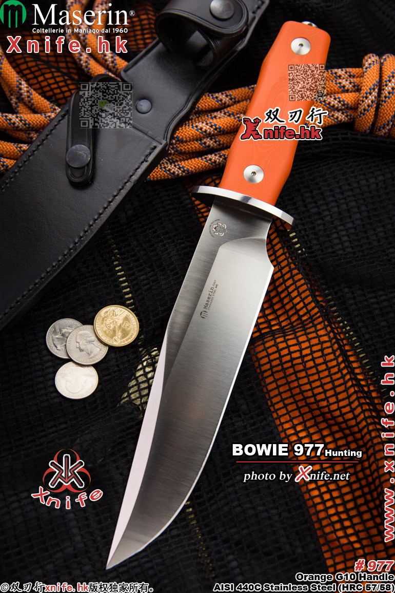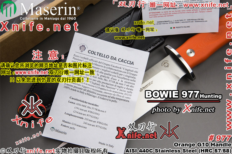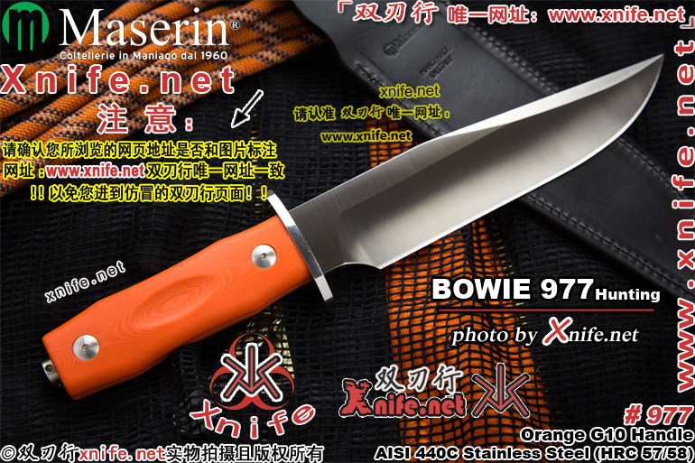 > Maserin 麦斯林(意大利) > Maserin 麦斯林(意大利)#977 "BOWIE Hunting-Knife" 麦斯林狩猎系列#977大型博伊猎直 AISI440C不锈钢(钢本色缎面处理)+桔色G10手柄 附带真皮鞘() ![]() |