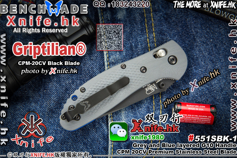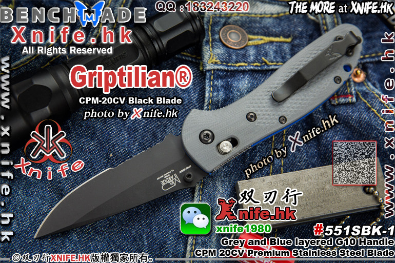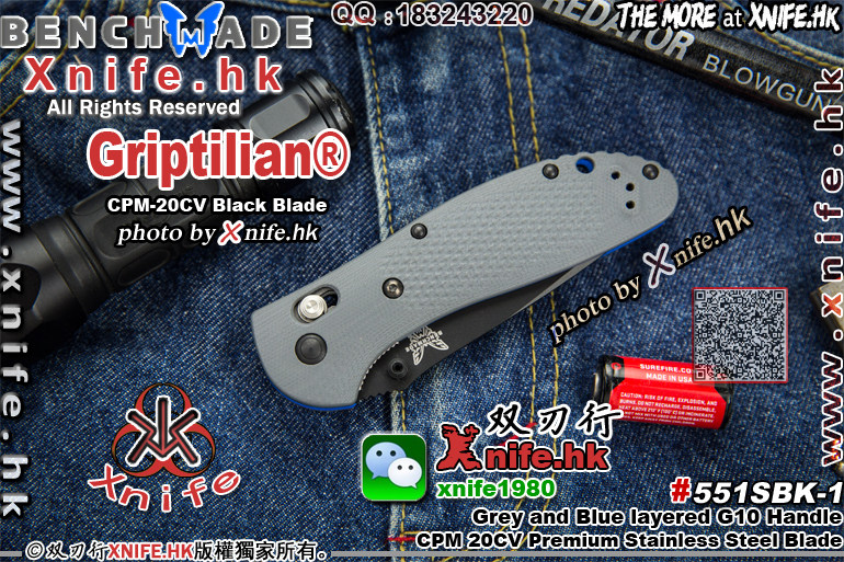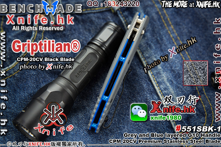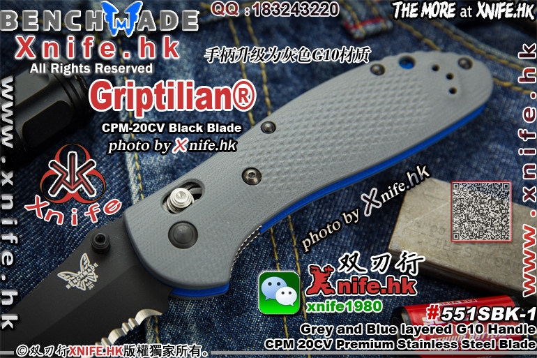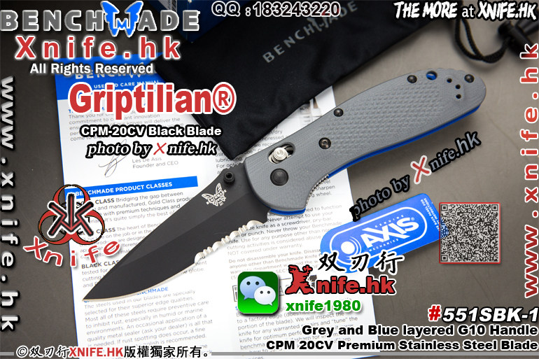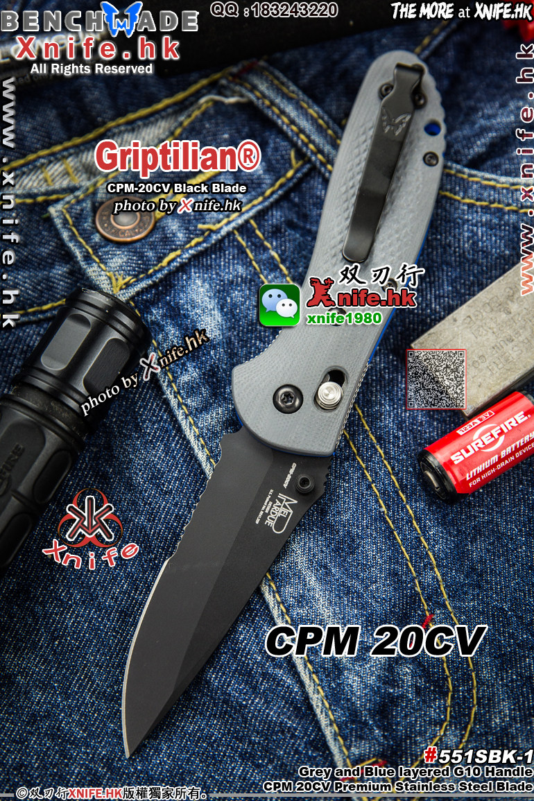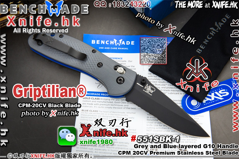 BENCHMADE 蝴蝶此款#551采用灰色和蓝色G10材质组成的手柄,刀身钢材升级为顶级 CPM 20CV粉末钢。 经典AXIS轴锁! 100%美国制造!