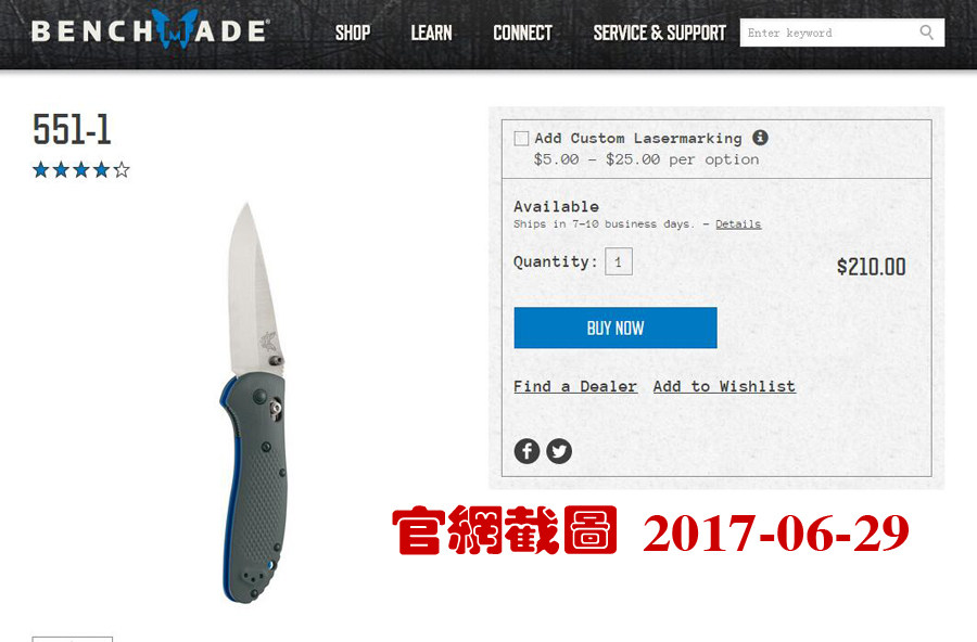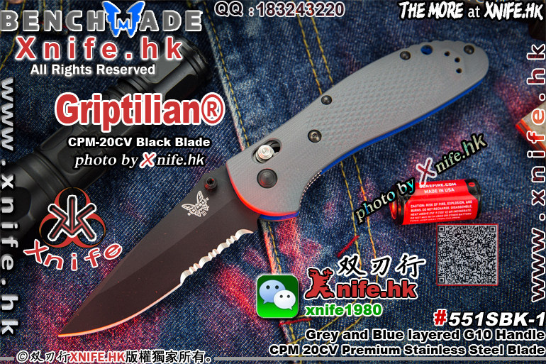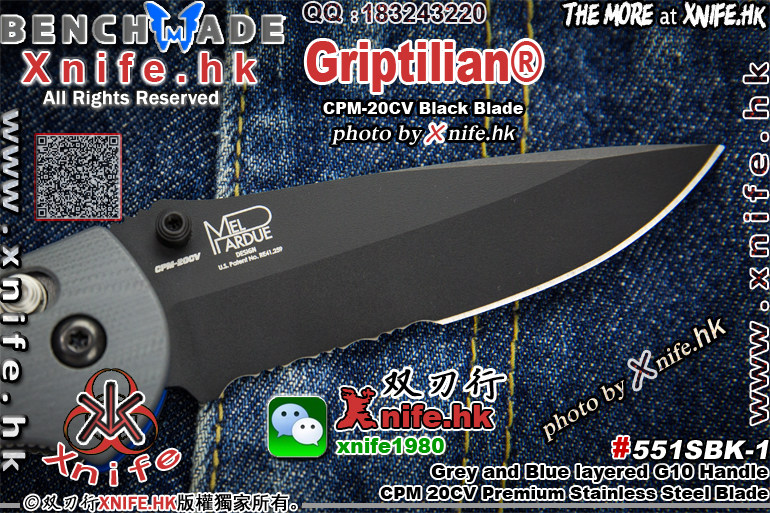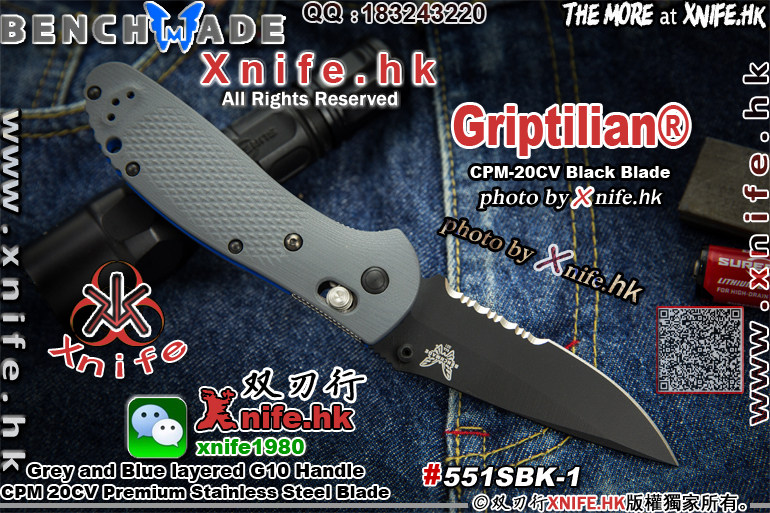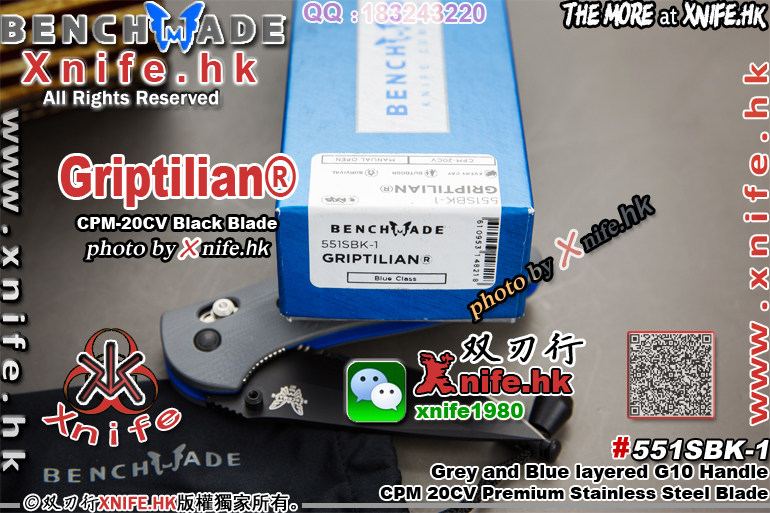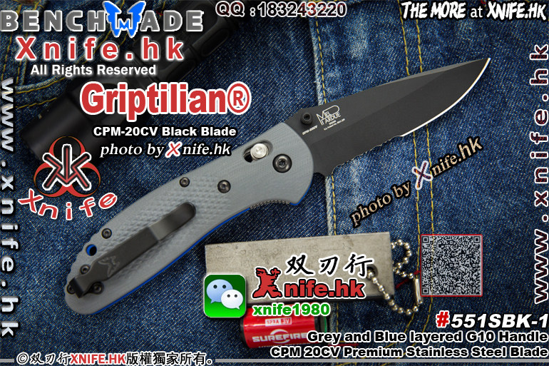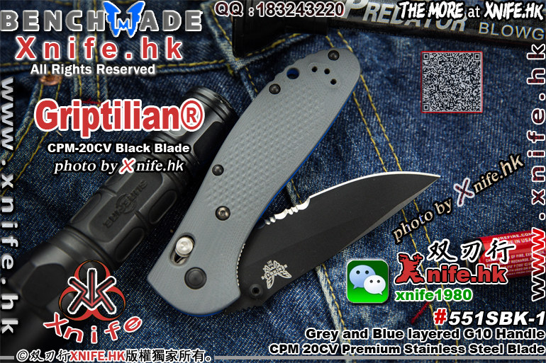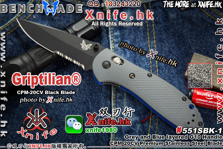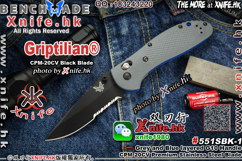 BENCHMADE 蝴蝶此款#551采用灰色和蓝色G10材质组成的手柄,刀身钢材升级为顶级 CPM 20CV粉末钢。 经典AXIS轴锁! 100%美国制造!