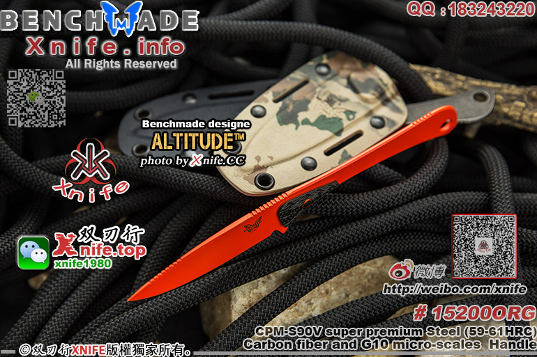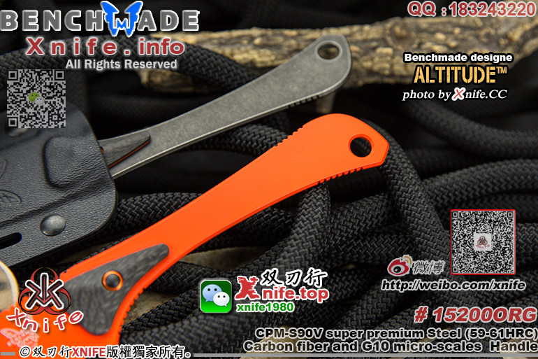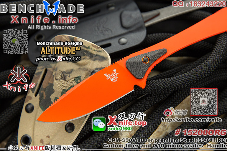 品 牌 BENCHMADE 蝴蝶 (官网地址:www.benchmade.com) www.xnife.net 双刃行 型 号 # 15200ORG " ALTITUDE™ " "海拔" 蝴蝶新款S90V超级粉末钢桔色刀身一体小猎刀
