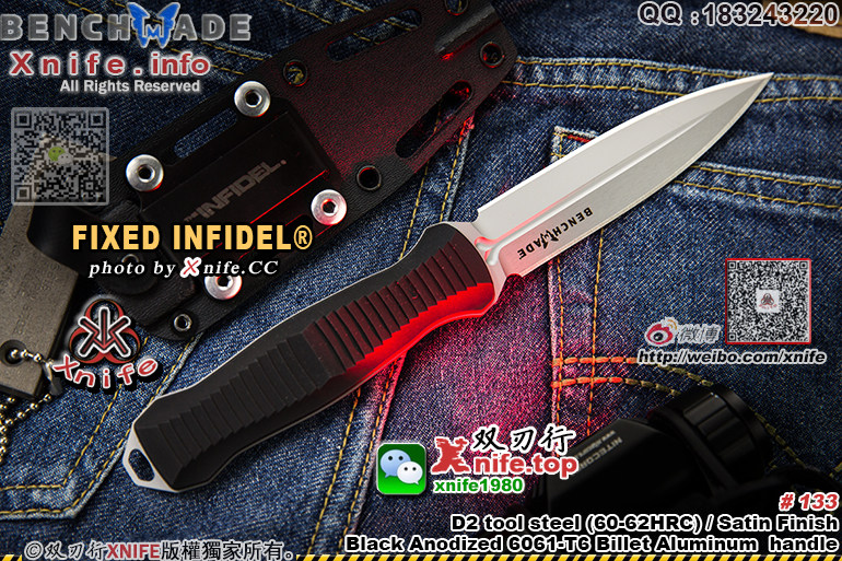 品 牌 BENCHMADE 蝴蝶 (官网地址:www.benchmade.com) www.xnife.net 双刃行 型 号 # 133 " FIXED INFIDEL® " “异教徒” D2钢 双锋 直刀版