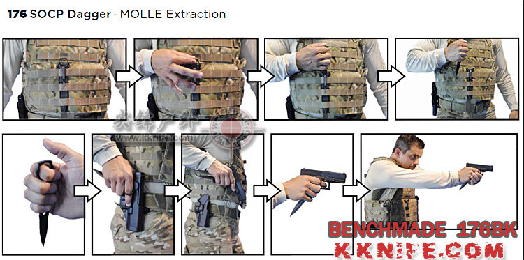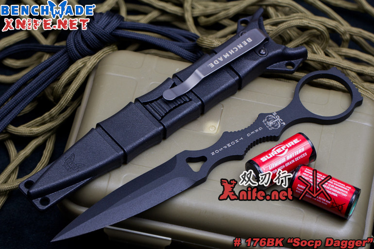 BENCHMADE 蝴蝶公司生产的新款手刺,此款手刺的设计者为前退役的美军特种部队教官Thompson,授权于蝴蝶公司负责生产和销售。此款176系列手刺是根据CQB(Close Quarters Battle 近距离遭遇战)实战所开发的一款近身格斗手刺,随刀配一个K鞘,在手刺尾部有一个很大的手指环,不论是徒手还是带着战术手套,士兵均可以最快的速度拔出。此款手刺由440C钢材打造,一体龙骨,坚固无比;在近战中,由于敌方士兵也可能身着厚厚的防护服,故普通折刀基本不会对身体造成伤害,而手刺则可以突破这些厚重的防护服,达到出其不意的效果,故此款手刺的格斗术已经被美军特种部队所采用,纳入了CQB训练当中。