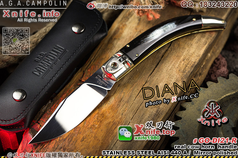 此款为AGA杠杆锁系列产品,于2015年创立的款式:“戴安娜”。DIANA-戴安娜 是罗马神话中的狩猎女神。事实上,这款更适合狩猎或者是作为EDC使用。它有着细长的形状和leverlock杠杆机械机构。这是一个全长21.5厘米、10厘米长的叶片。拥有着比其他品牌更厚的刃厚(此款系列为3.5毫米)和更好的研磨,使得它比其他品牌更锋利,而衬板是采用传统黄铜制造。刀身采用440 C不锈钢制作,镜面抛光处理;传统手工制作的镍银材质的护手让您触摸它时会感受到不一样的质感,同时,你会惊讶这种传统刀型会做的如此精致和高质量。同时附带一个手工缝制的皮革收纳套!