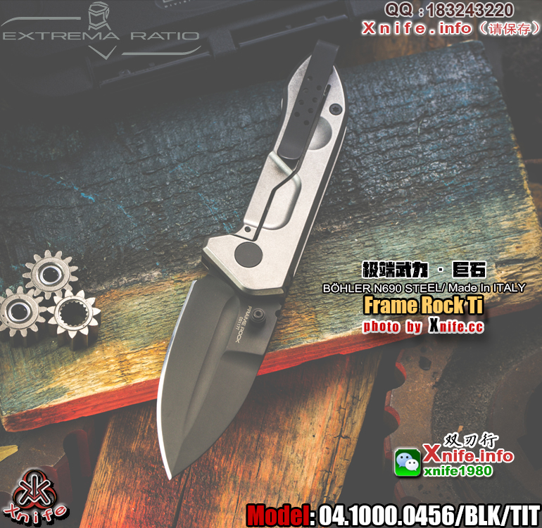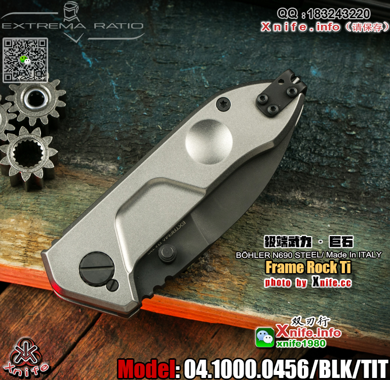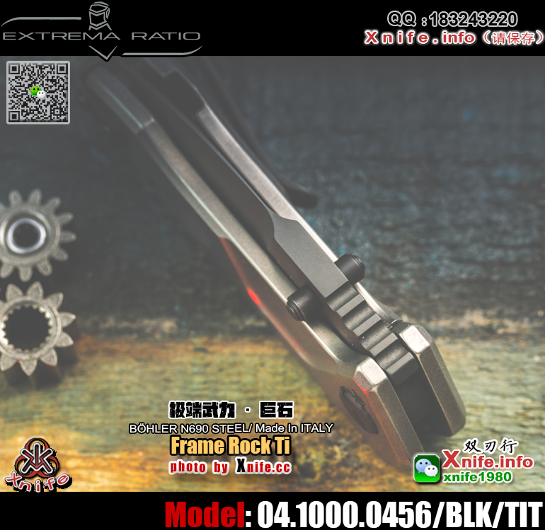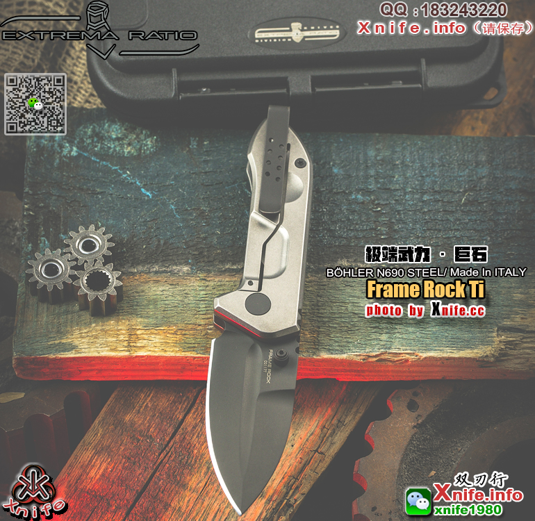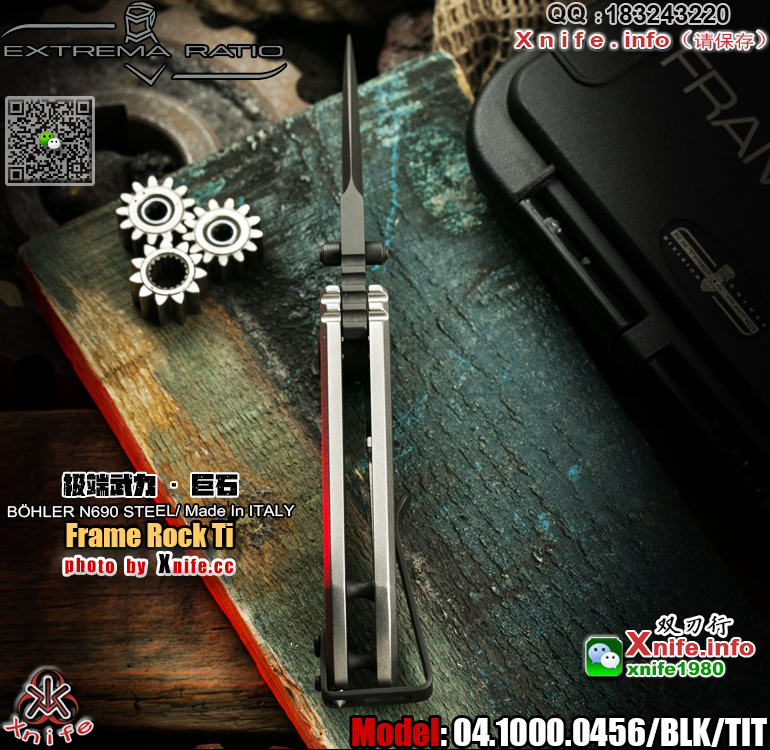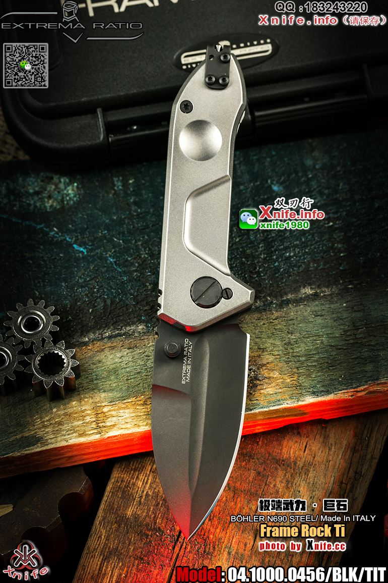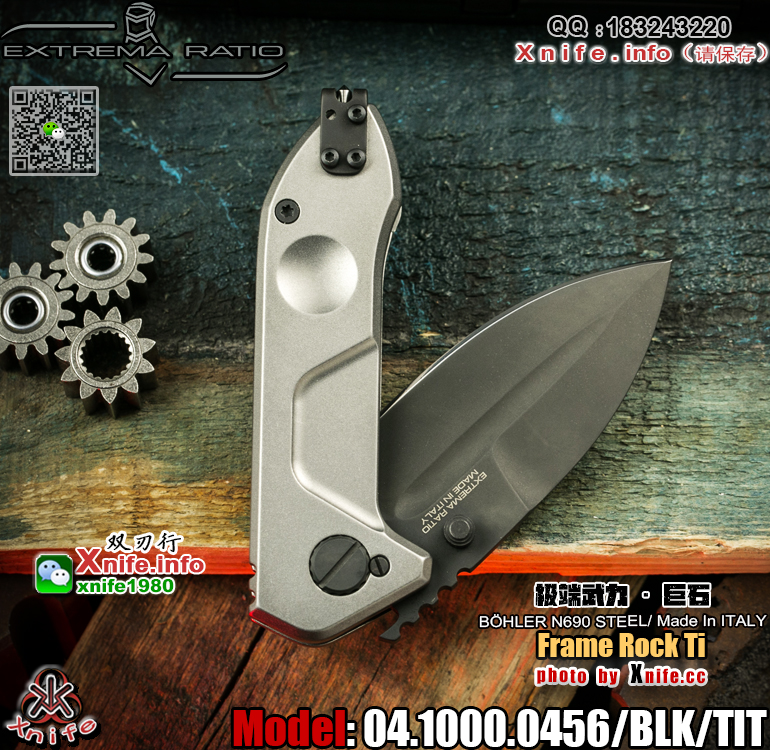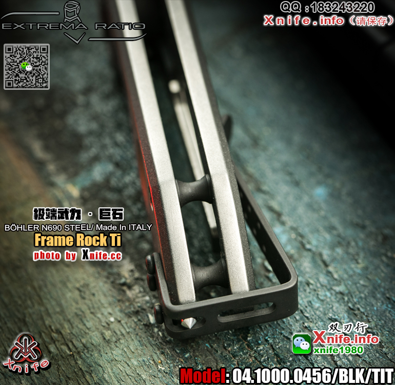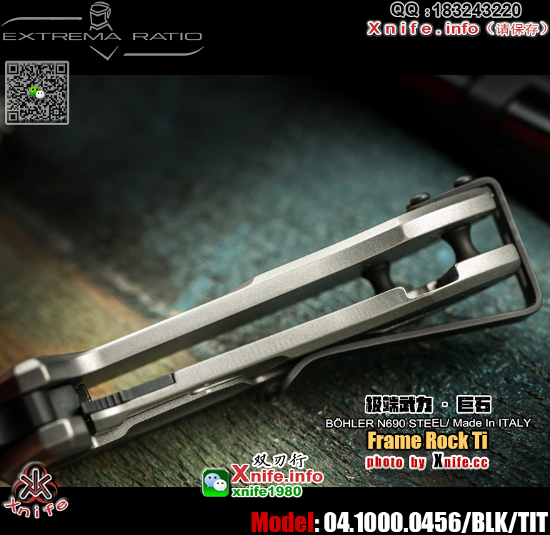 Extreme Ratio Frame Rock是一款基于Ti Rock设计的新型刀具,这是一款成功的框架锁定定制刀具,Extreme Ratio已为一家著名的意大利经销商实现。Extreme Ratio Frame Rock的特点是钛制握把,具有很强的韧性,但重量很轻。框架锁的完整性和持续时间通过可轻松更换的热处理钢插件来保证不受磨损。与前代的落点式不同,Frame Rock有一个3英寸(75毫米)长、0.23英寸(6.0毫米)厚的矛尖刀片,填充以提高亮度。叶片采用Bohler N690钢,热处理至58 HRC。它可以是黑色的DLC处理或石洗饰面。为了使开启更加顺畅和轻松,刀片以滚珠轴承为枢轴。该机构允许用户通过螺钉调节将刀片从关闭位置释放所需的力。可翻转夹子的形状允许口袋中有一个隐藏的端口,使刀从外面看不见。握把大而匀称,刀片结实,使它能够完成繁重的任务。Frame Rock的重量只有9.6盎司(270克),对于这样一把结实的刀来说,它相当轻。它配有一个特殊的ABS外壳。
