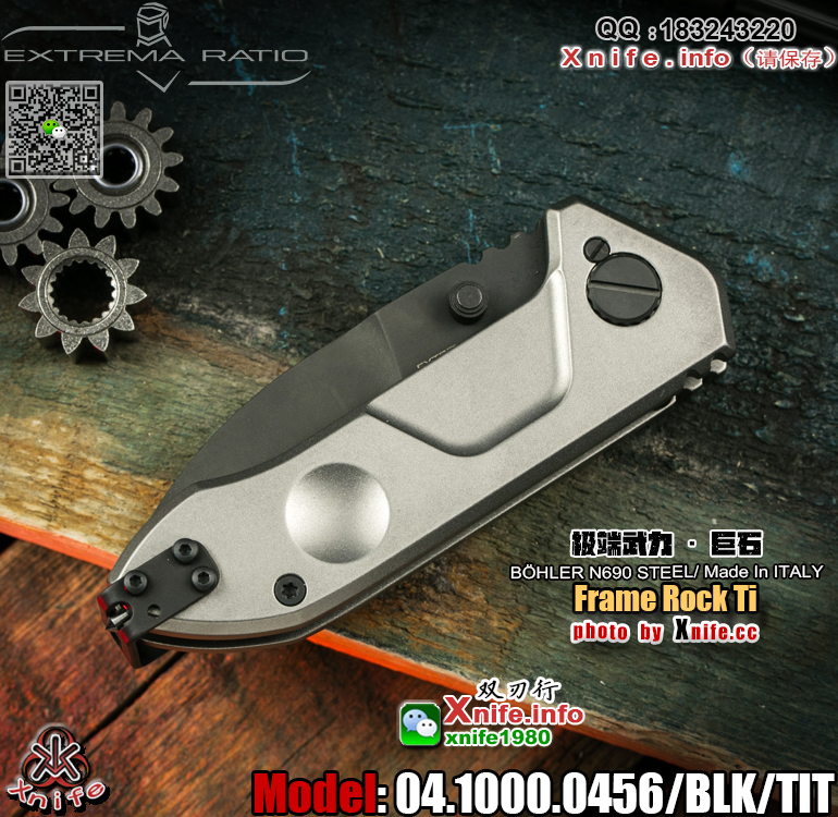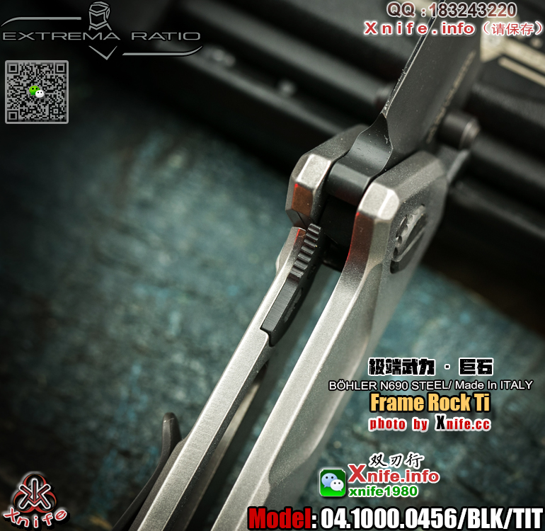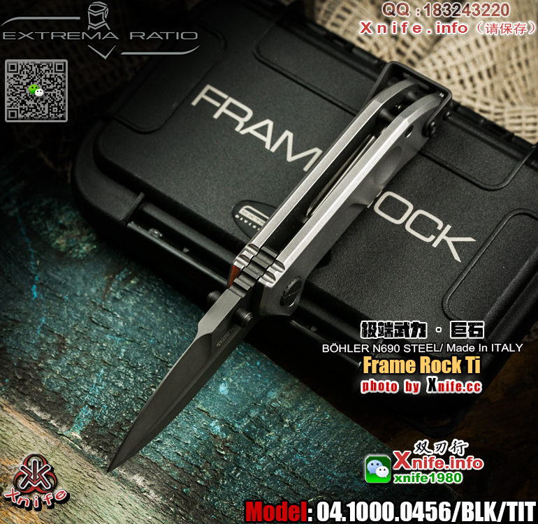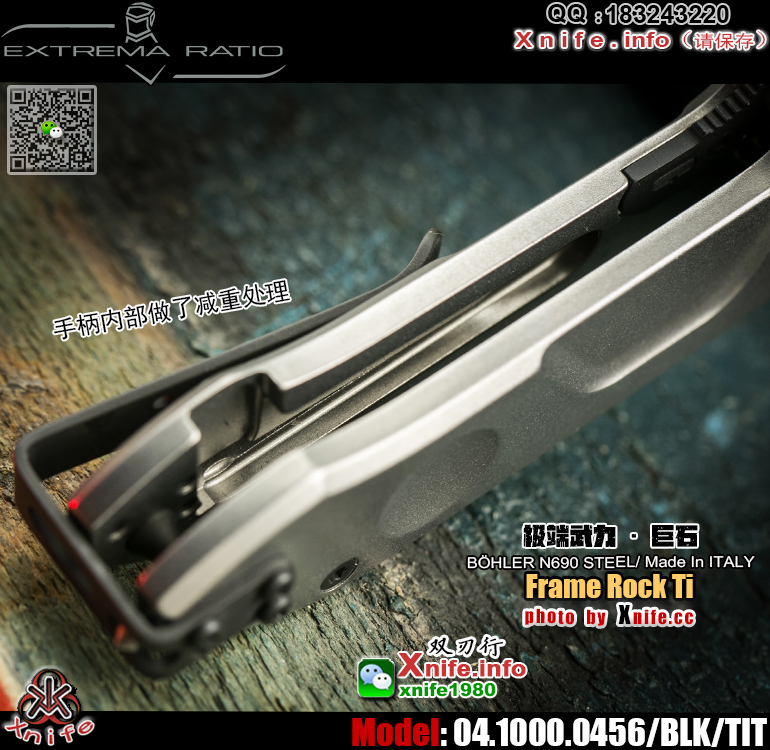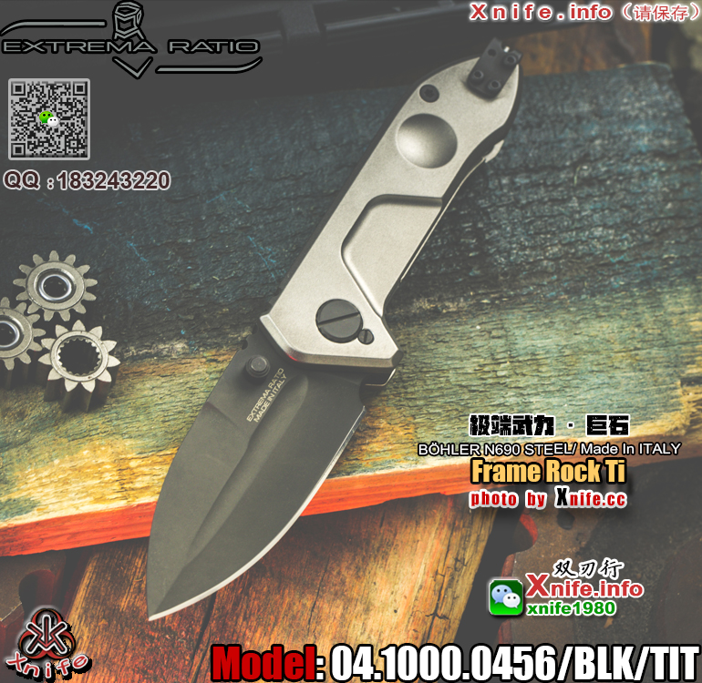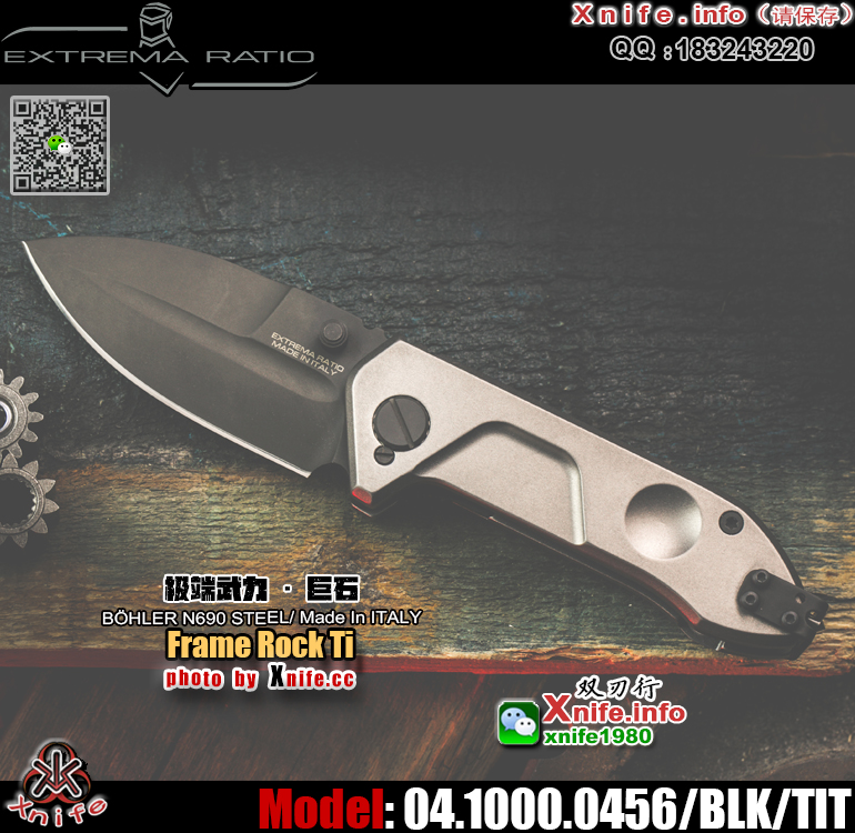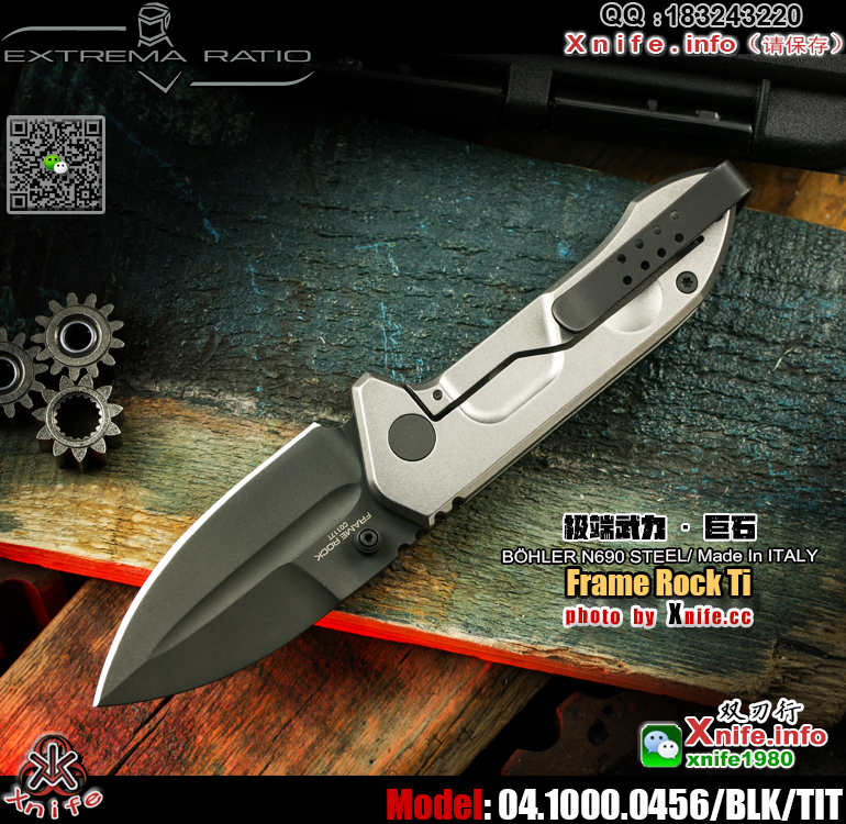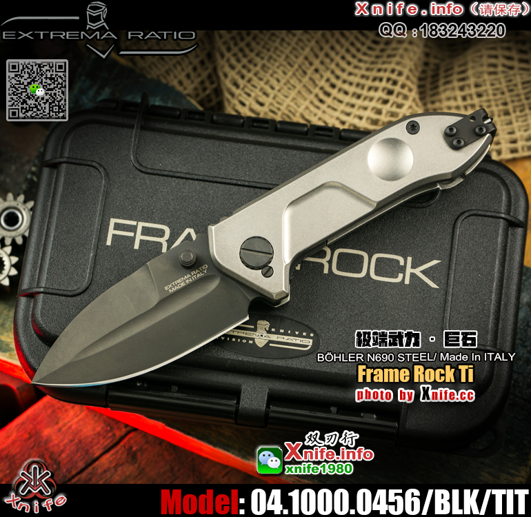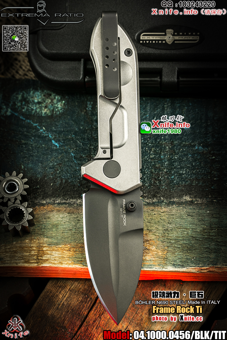 Extreme Ratio Frame Rock是一款基于Ti Rock设计的新型刀具,这是一款成功的框架锁定定制刀具,Extreme Ratio已为一家著名的意大利经销商实现。Extreme Ratio Frame Rock的特点是钛制握把,具有很强的韧性,但重量很轻。框架锁的完整性和持续时间通过可轻松更换的热处理钢插件来保证不受磨损。与前代的落点式不同,Frame Rock有一个3英寸(75毫米)长、0.23英寸(6.0毫米)厚的矛尖刀片,填充以提高亮度。叶片采用Bohler N690钢,热处理至58 HRC。它可以是黑色的DLC处理或石洗饰面。为了使开启更加顺畅和轻松,刀片以滚珠轴承为枢轴。该机构允许用户通过螺钉调节将刀片从关闭位置释放所需的力。可翻转夹子的形状允许口袋中有一个隐藏的端口,使刀从外面看不见。握把大而匀称,刀片结实,使它能够完成繁重的任务。Frame Rock的重量只有9.6盎司(270克),对于这样一把结实的刀来说,它相当轻。它配有一个特殊的ABS外壳。