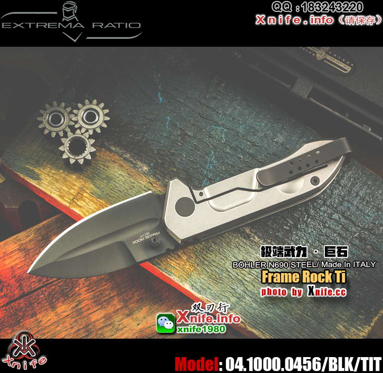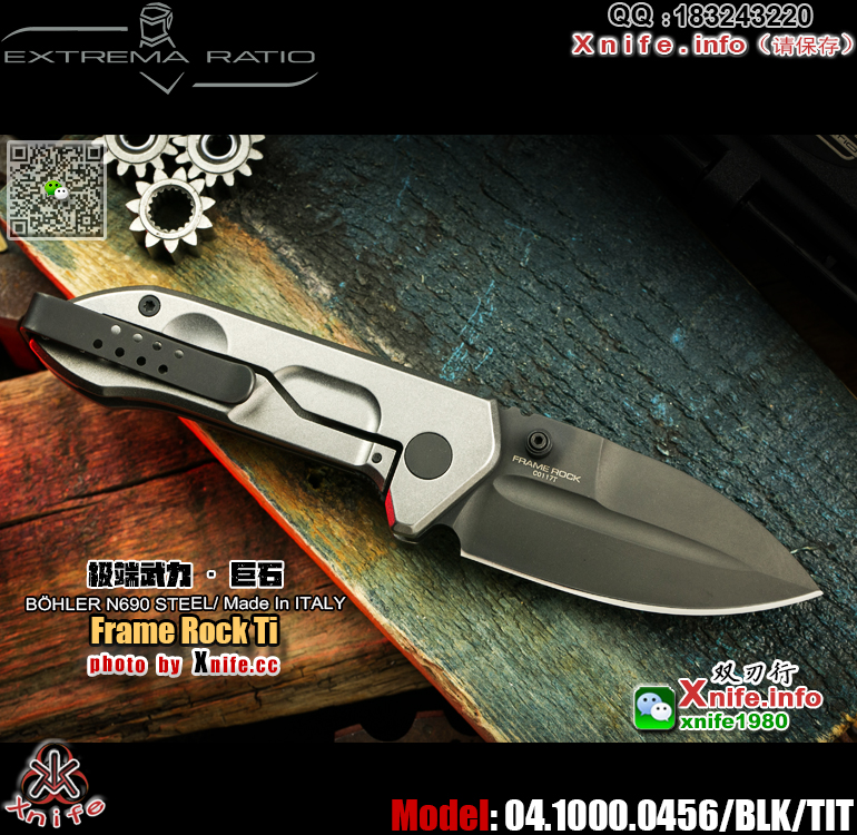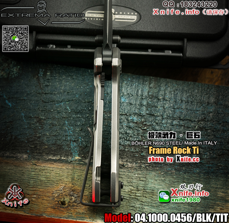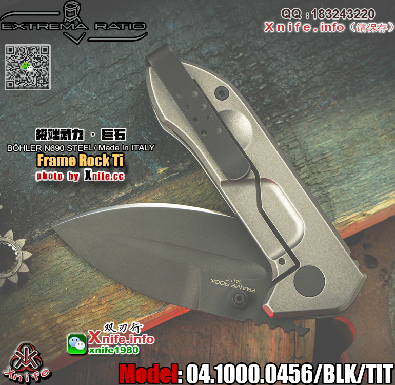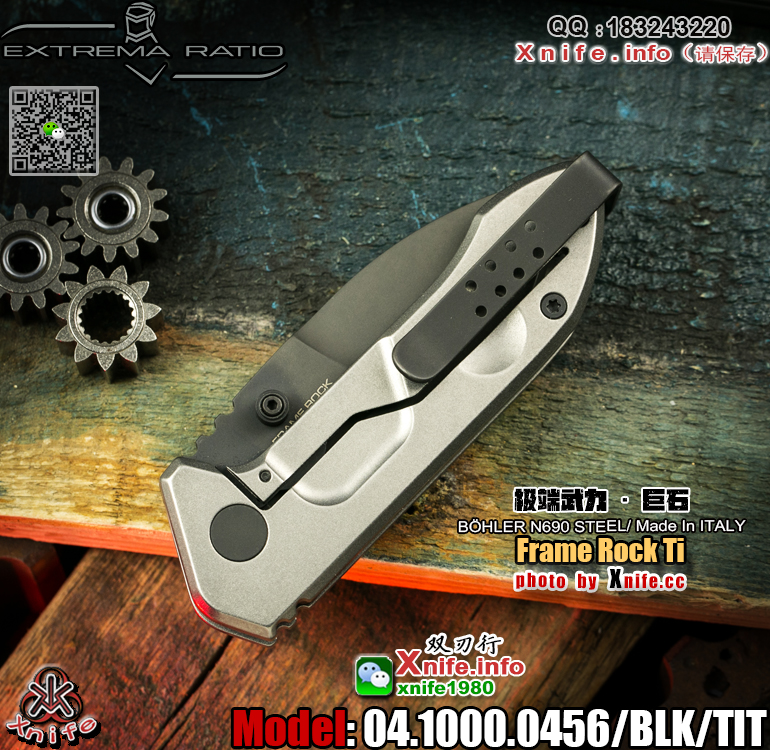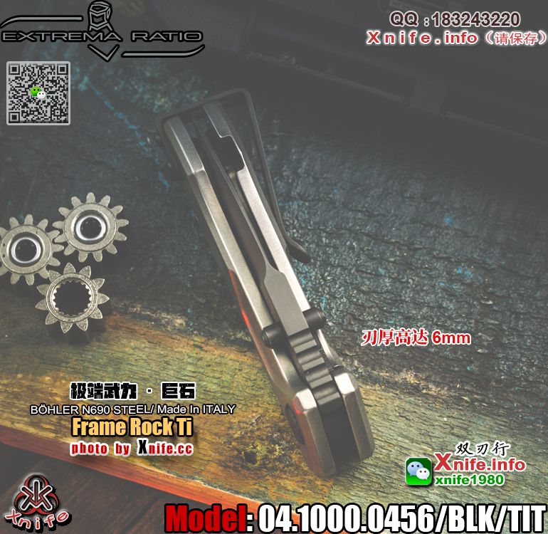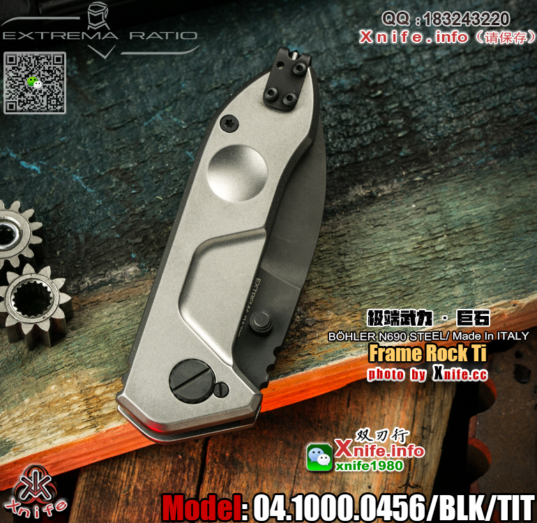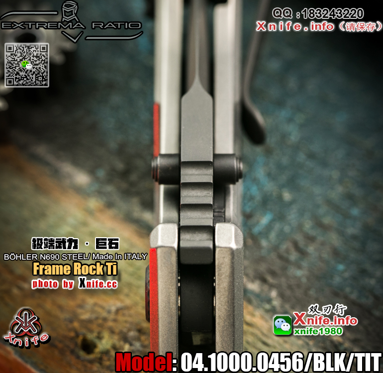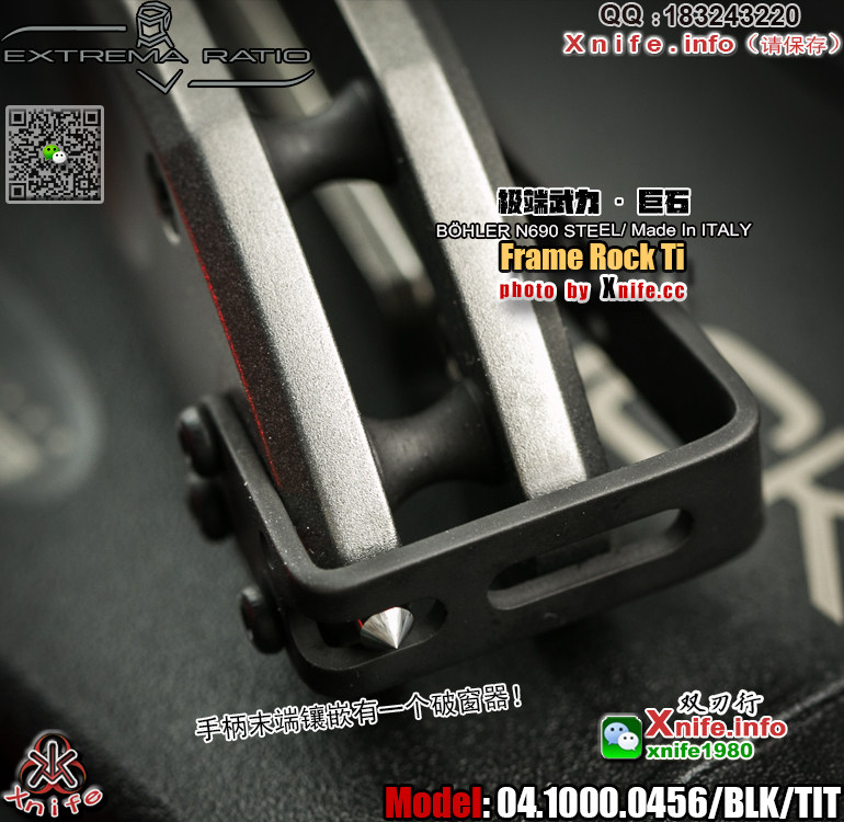 Extreme Ratio Frame Rock是一款基于Ti Rock设计的新型刀具,这是一款成功的框架锁定定制刀具,Extreme Ratio已为一家著名的意大利经销商实现。Extreme Ratio Frame Rock的特点是钛制握把,具有很强的韧性,但重量很轻。框架锁的完整性和持续时间通过可轻松更换的热处理钢插件来保证不受磨损。与前代的落点式不同,Frame Rock有一个3英寸(75毫米)长、0.23英寸(6.0毫米)厚的矛尖刀片,填充以提高亮度。叶片采用Bohler N690钢,热处理至58 HRC。它可以是黑色的DLC处理或石洗饰面。为了使开启更加顺畅和轻松,刀片以滚珠轴承为枢轴。该机构允许用户通过螺钉调节将刀片从关闭位置释放所需的力。可翻转夹子的形状允许口袋中有一个隐藏的端口,使刀从外面看不见。握把大而匀称,刀片结实,使它能够完成繁重的任务。Frame Rock的重量只有9.6盎司(270克),对于这样一把结实的刀来说,它相当轻。它配有一个特殊的ABS外壳。