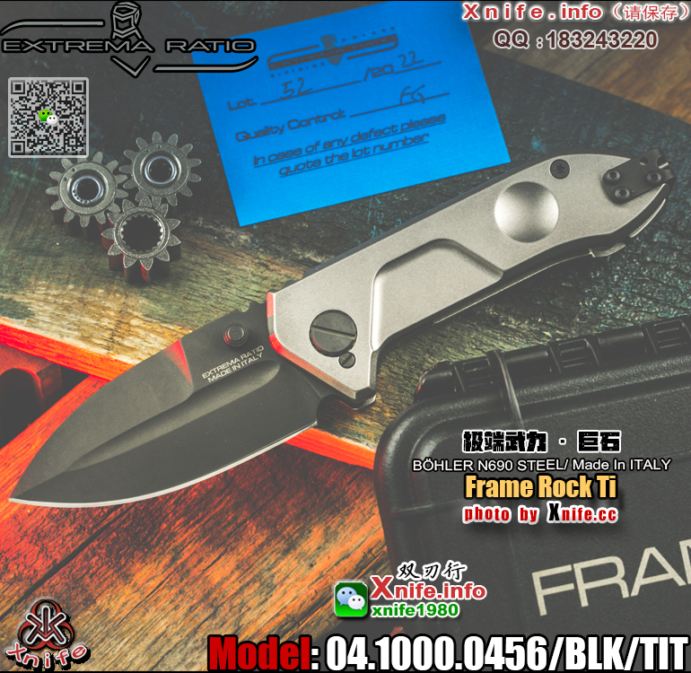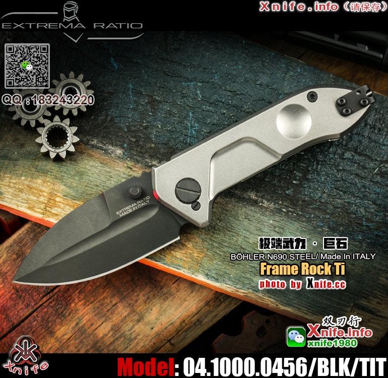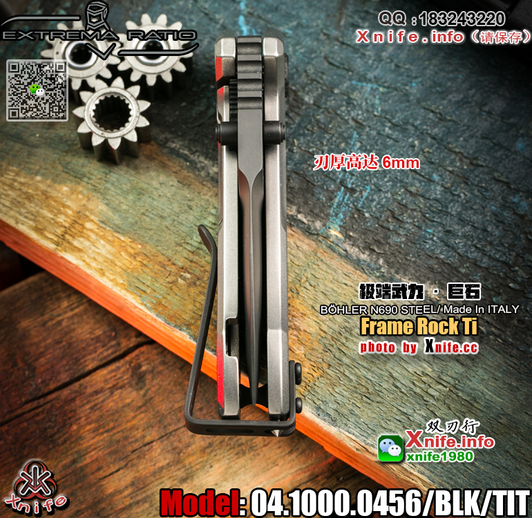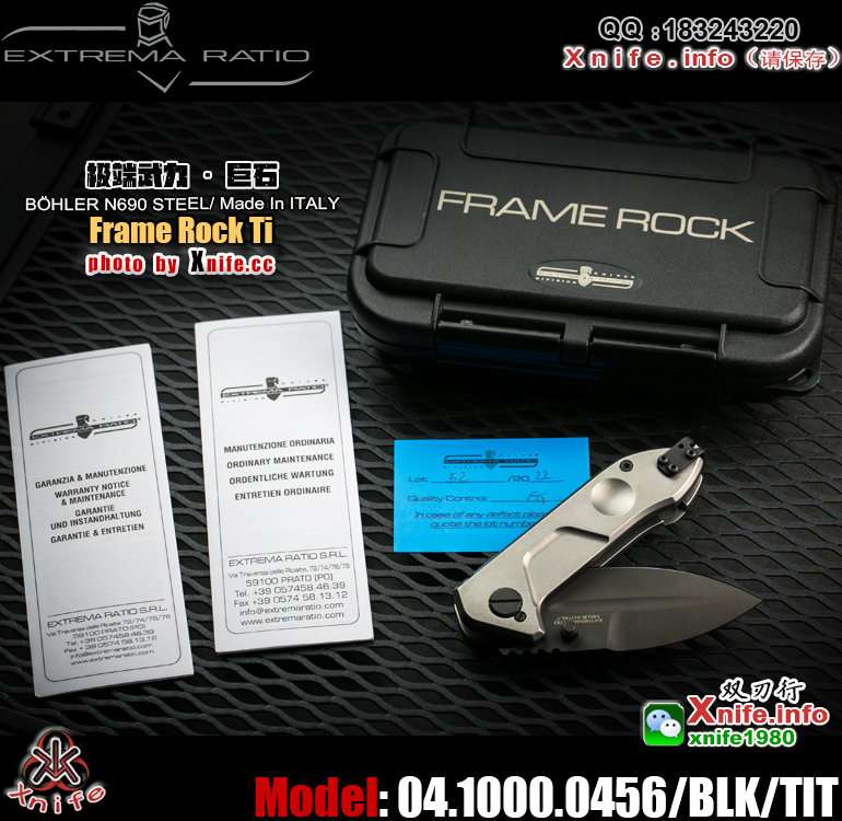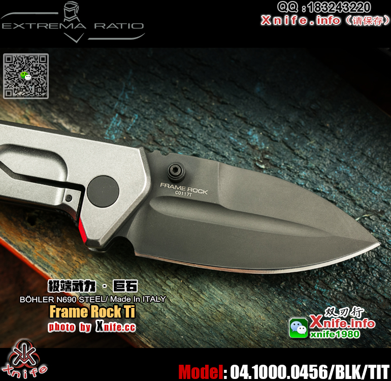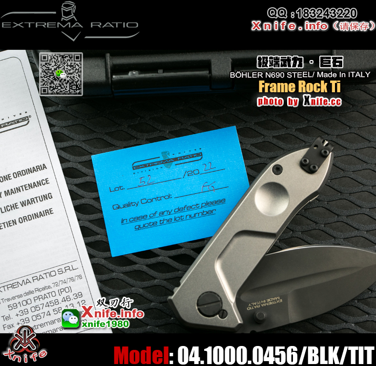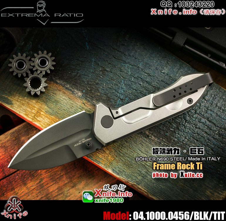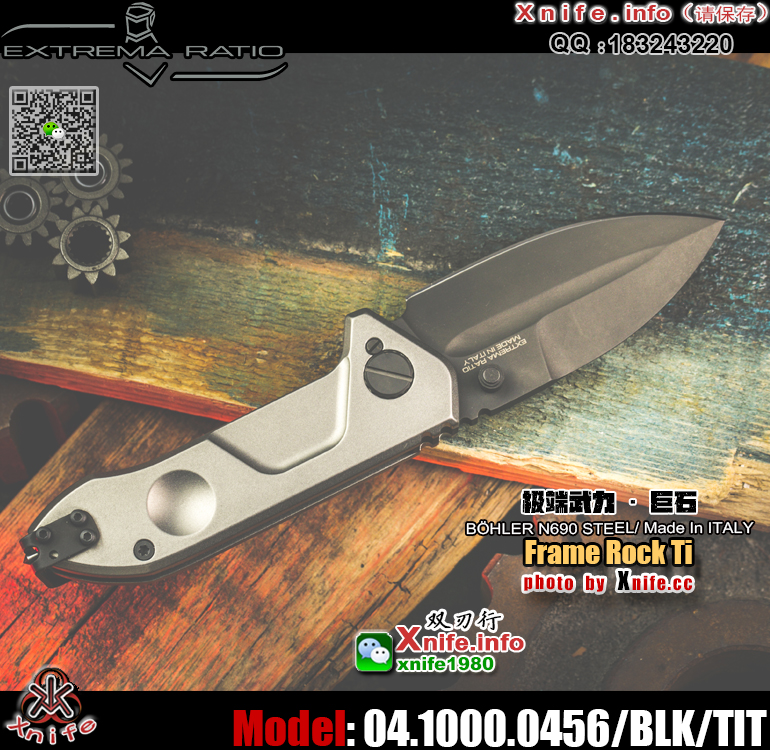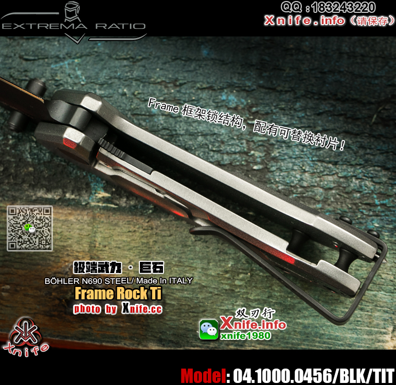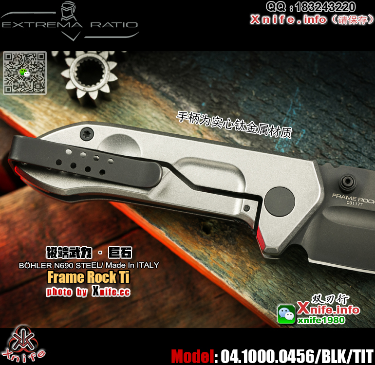 Extreme Ratio Frame Rock是一款基于Ti Rock设计的新型刀具,这是一款成功的框架锁定定制刀具,Extreme Ratio已为一家著名的意大利经销商实现。Extreme Ratio Frame Rock的特点是钛制握把,具有很强的韧性,但重量很轻。框架锁的完整性和持续时间通过可轻松更换的热处理钢插件来保证不受磨损。与前代的落点式不同,Frame Rock有一个3英寸(75毫米)长、0.23英寸(6.0毫米)厚的矛尖刀片,填充以提高亮度。叶片采用Bohler N690钢,热处理至58 HRC。它可以是黑色的DLC处理或石洗饰面。为了使开启更加顺畅和轻松,刀片以滚珠轴承为枢轴。该机构允许用户通过螺钉调节将刀片从关闭位置释放所需的力。可翻转夹子的形状允许口袋中有一个隐藏的端口,使刀从外面看不见。握把大而匀称,刀片结实,使它能够完成繁重的任务。Frame Rock的重量只有9.6盎司(270克),对于这样一把结实的刀来说,它相当轻。它配有一个特殊的ABS外壳。
