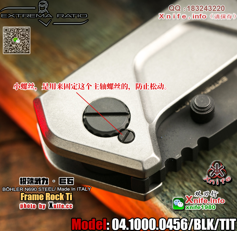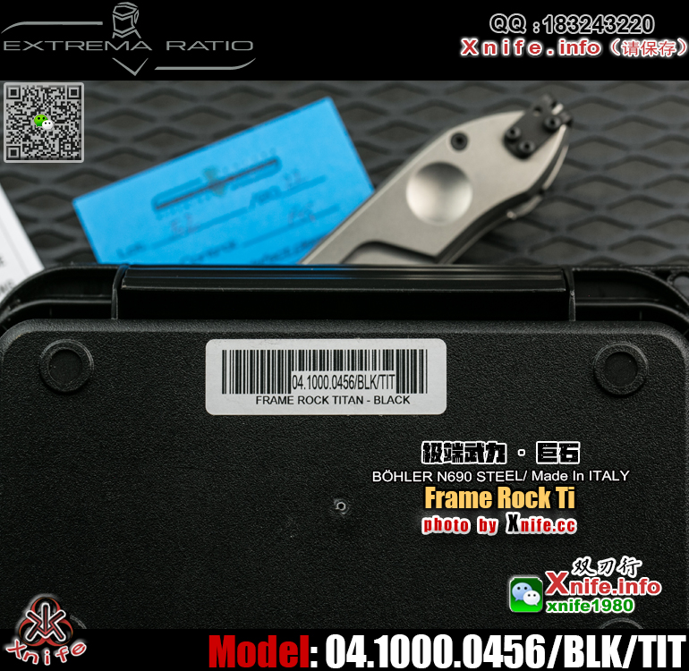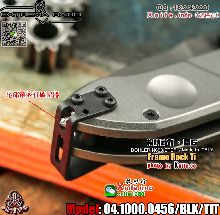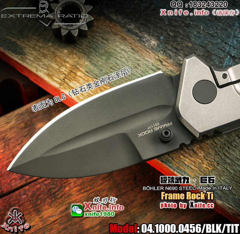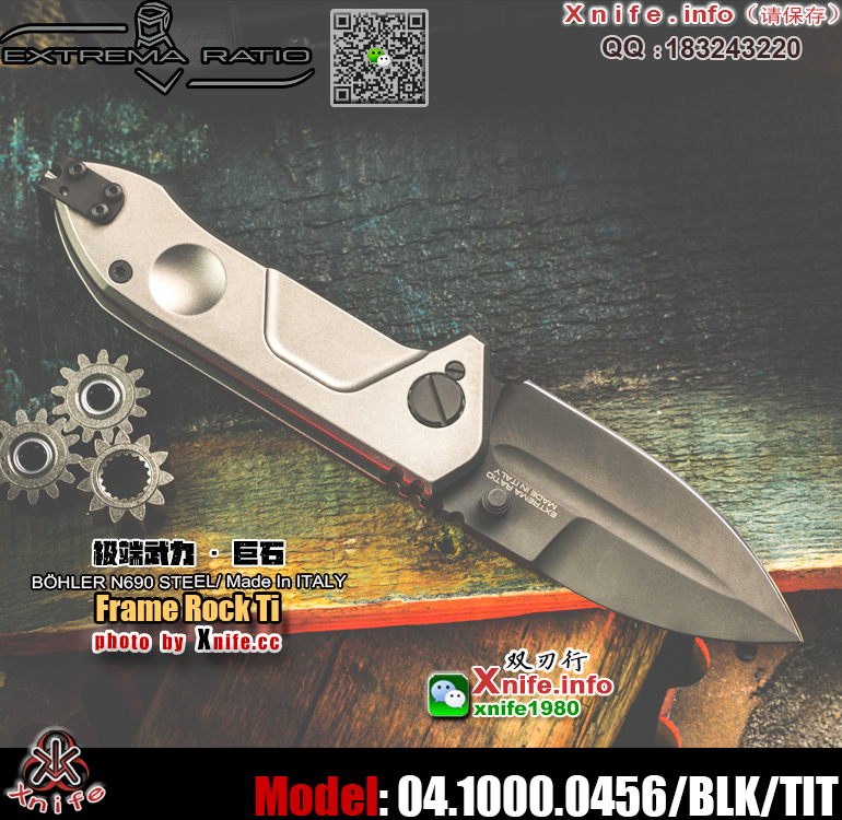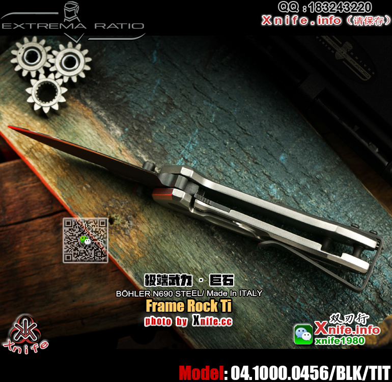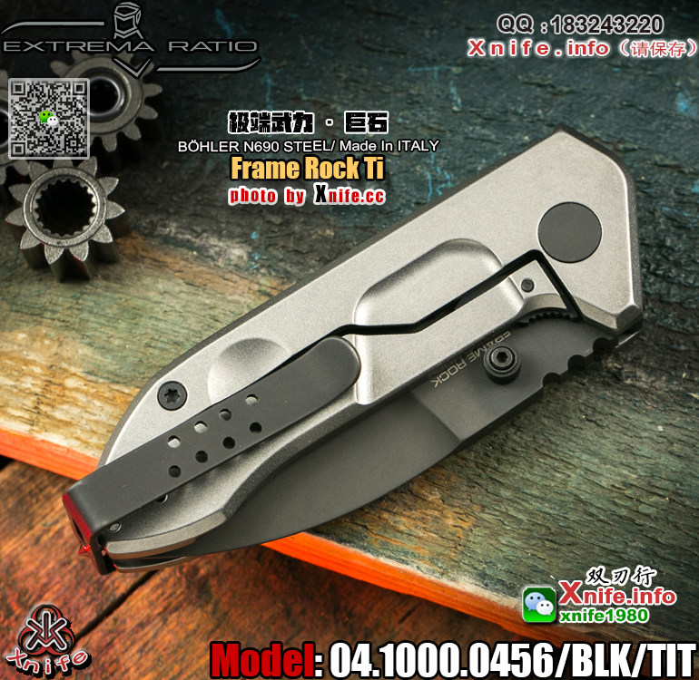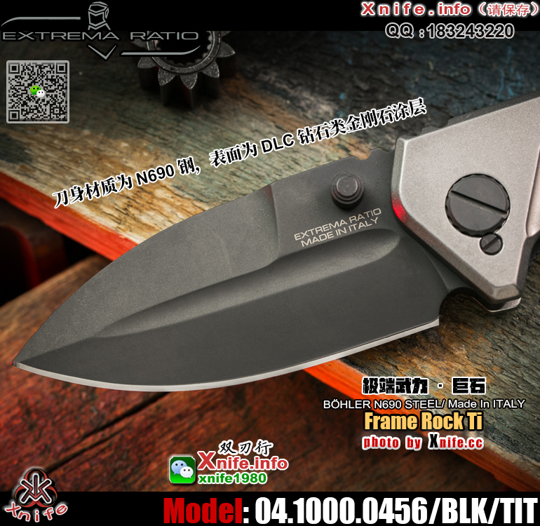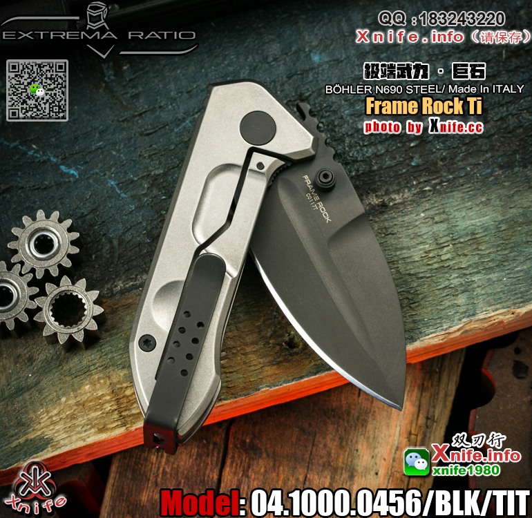 Extreme Ratio Frame Rock是一款基于Ti Rock设计的新型刀具,这是一款成功的框架锁定定制刀具,Extreme Ratio已为一家著名的意大利经销商实现。Extreme Ratio Frame Rock的特点是钛制握把,具有很强的韧性,但重量很轻。框架锁的完整性和持续时间通过可轻松更换的热处理钢插件来保证不受磨损。与前代的落点式不同,Frame Rock有一个3英寸(75毫米)长、0.23英寸(6.0毫米)厚的矛尖刀片,填充以提高亮度。叶片采用Bohler N690钢,热处理至58 HRC。它可以是黑色的DLC处理或石洗饰面。为了使开启更加顺畅和轻松,刀片以滚珠轴承为枢轴。该机构允许用户通过螺钉调节将刀片从关闭位置释放所需的力。可翻转夹子的形状允许口袋中有一个隐藏的端口,使刀从外面看不见。握把大而匀称,刀片结实,使它能够完成繁重的任务。Frame Rock的重量只有9.6盎司(270克),对于这样一把结实的刀来说,它相当轻。它配有一个特殊的ABS外壳。