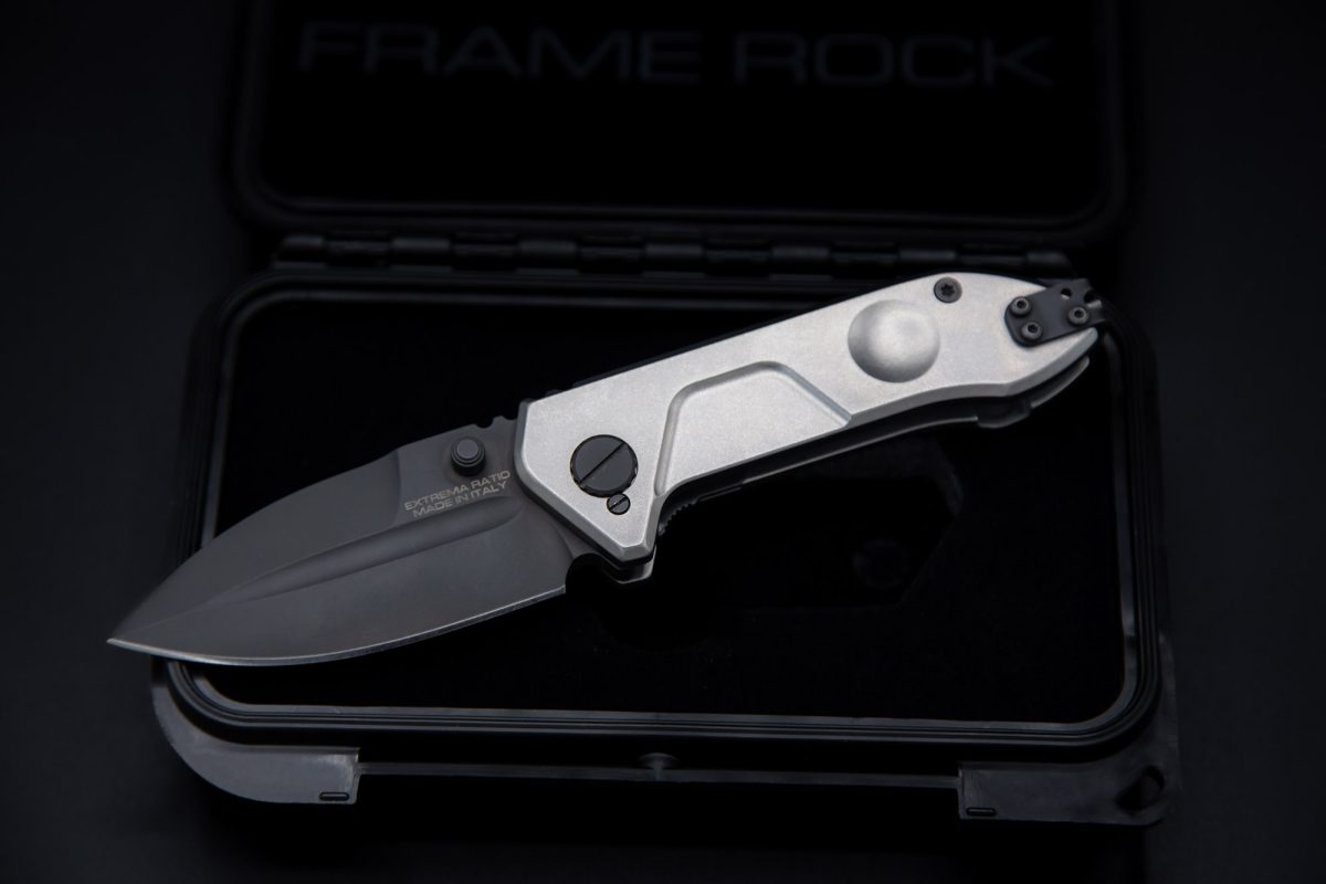 The Extrema Ratio Frame Rock is a new knife, based on the design of the Ti-Rock, a successful framelock custom made knife that Extrema Ratio has realized for a renowned Italian distributor. The Extrema Ratio Frame Rock is characterized by the titanium grip that offers great toughness and yet is very light. The frame lock integrity and duration are guaranteed against wear by a heat-treated steel insert that can be easily replaced. Differently from its drop-point predecessor, the Frame Rock has a spearpoint blade, 3” (75 mm) long, 0.23” (6.0 mm) thick, fullered for further lightness. The blade is in Bohler N690 steel, heat treated to 58 HRC. It can be had in black with DLC treatmet or stone washed finish. To make opening even smoother and effortless, the blade pivots on ball bearings. This mechanism allows the user to adjust the force needed to free the blade from the closed position thanks to a screw. The shape of the reversible clip allows a hidden port in the pocket, making the knife not visible from the outside. The grip, large and well proportioned and the stocky blade allow it to tackle heavy tasks. The Frame Rock weighs just 9.6 oz (270 g) making it quite light for such a robust knife. It comes with a special ABS case.