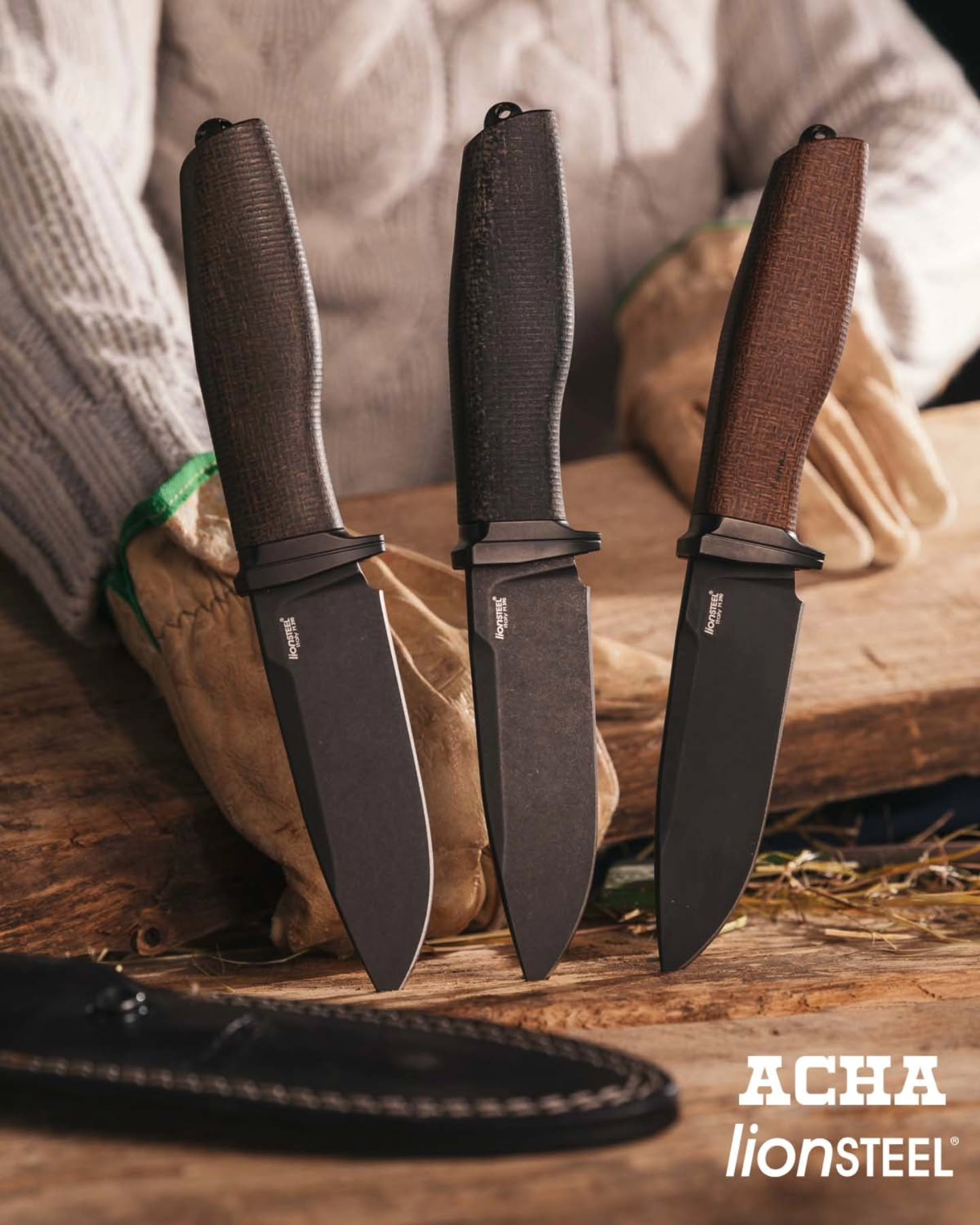 此款ACHA系列是LionSteel公司特别推出的一款为精致户外而设计的一款精致紧凑的户外露营直刀。刀身采用M390不锈钢制造,表面为黑色PVD涂层后又做了一遍石洗处理的双重处理,可以最大化去除涂层脱落的风险;刀身设计紧凑流畅;护手的部分则采用了钛金属材质,更轻更耐用;手柄则为天然粗布米卡塔材质,表面为采用人体工学设计,并采用3D立体雕花工艺雕刻的立体防滑纹理手柄,握感舒适;同时提供一个全金属材质的手柄拆卸工具,通过这个自带的拆卸工具可自行拆解手柄,达到日常养护的目的;同时,此款刀具配备一个意大利手工缝制的精致真皮收纳套!