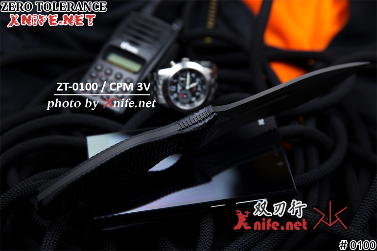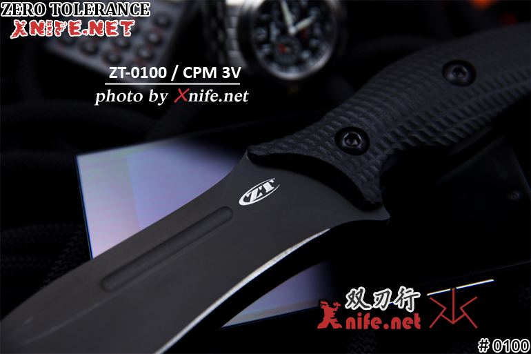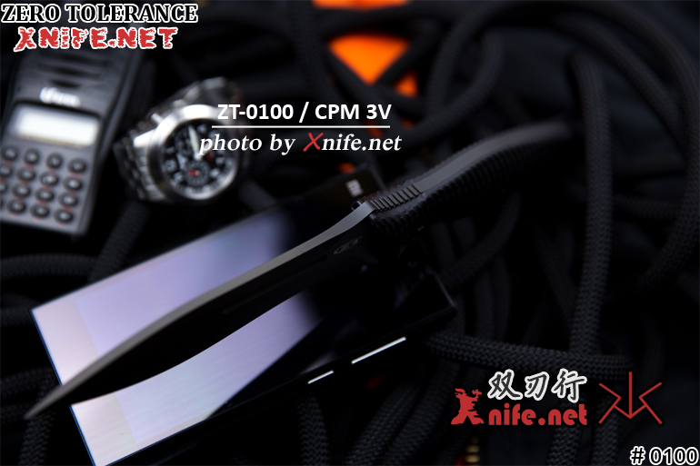 The blade is CPM 3V tool steel and is 0.19 in. (0.48 cm) thick. Crucible’s CPM Particle Metallurgy process creates steel that is more uniform and dense, improving both wear resistance and toughness. 3V is designed to provide maximum resistance to breakage and chipping and to hold its edge longer. It offers impact toughness approaching the levels of shock resistant grades, while providing high hardness and thermal stability for coatings. With a Rockwell rating of 58-60, 3V is the steel for tools that have to perform under the harshest of field conditions. ZT coats the 0100’s blade with black Tungsten DLC (Diamond-Like Carbon) to protect the blade from staining and for non-reflectivity.