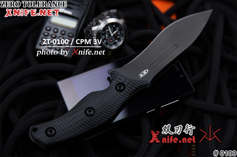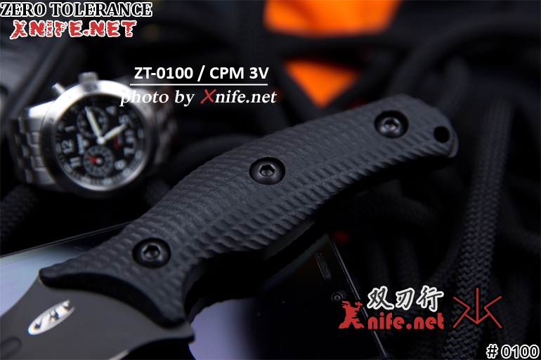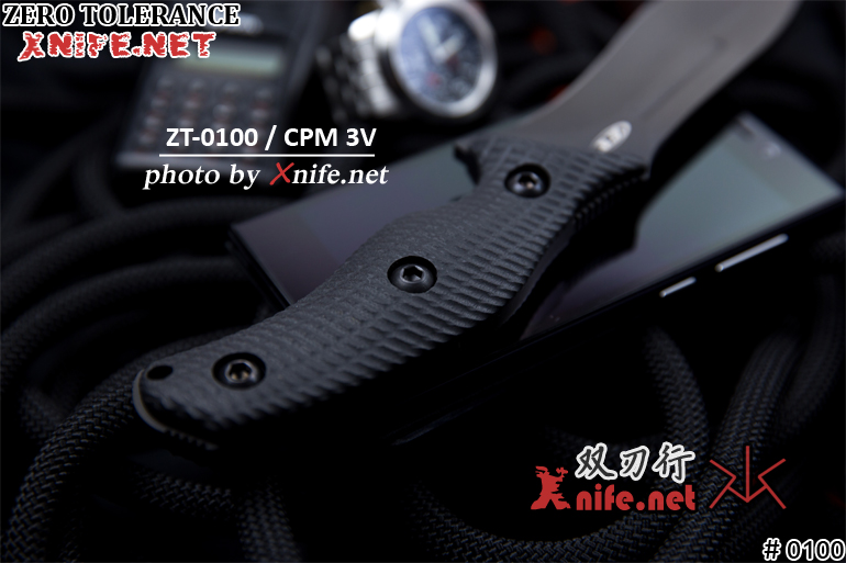 代号为0100 的"G10柄战术直刀",主要由Kershaw的Ken Onion负责主要设计,使用CPM3V工具钢制成,并运用「碳化钨涂层(Tungsten DLC Coating)」处理。碳化钨涂层具有高耐磨耗性、高化学钝性、低摩擦系数等优点,大幅度地增加刀刃的耐用度与切割能力。握柄为厚实的G-10材质,并以机器3D立体刻纹,具有高度的防滑能力。