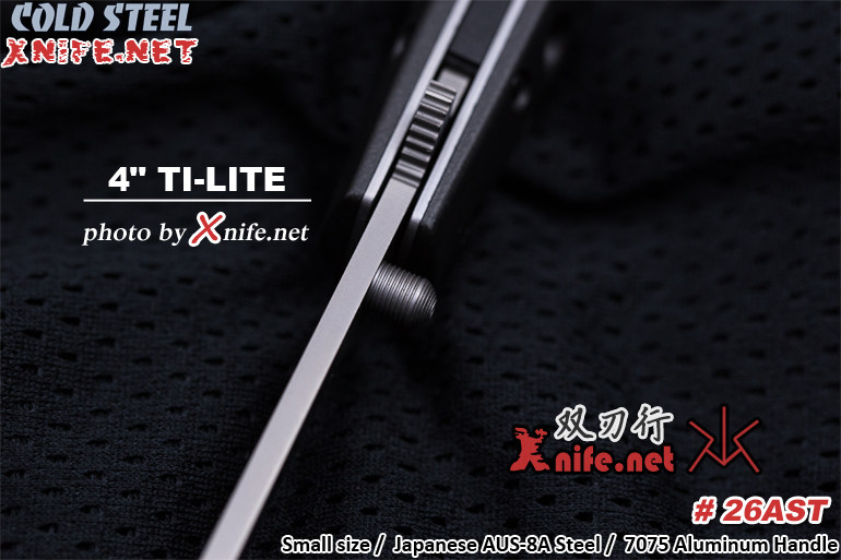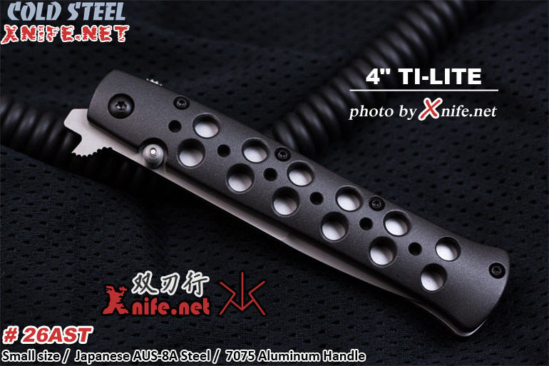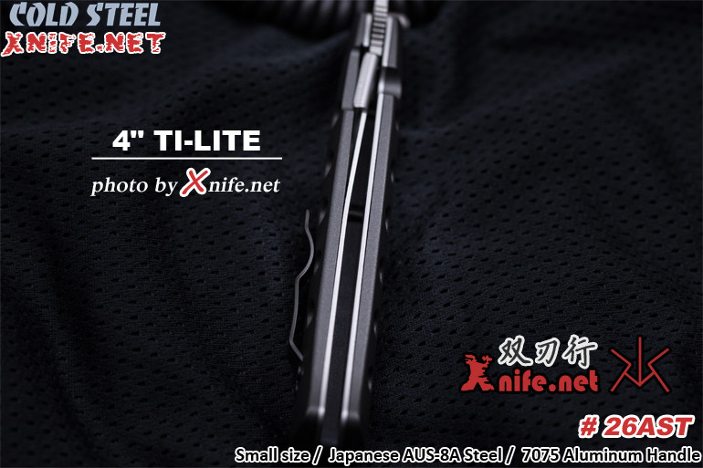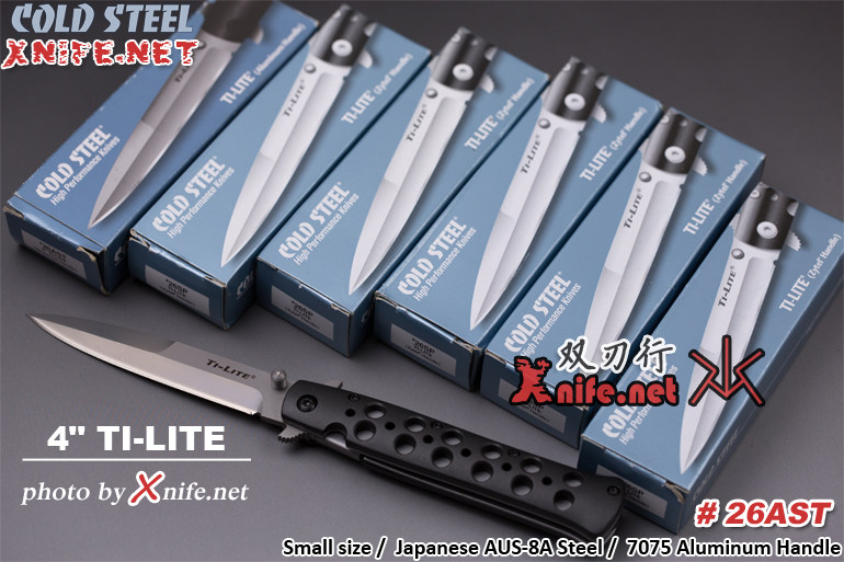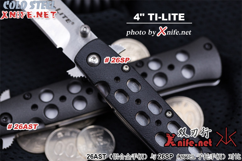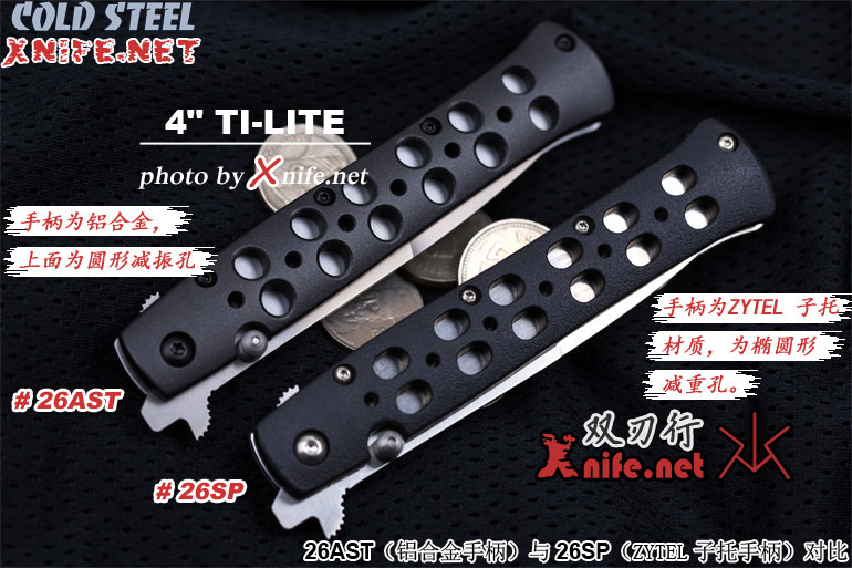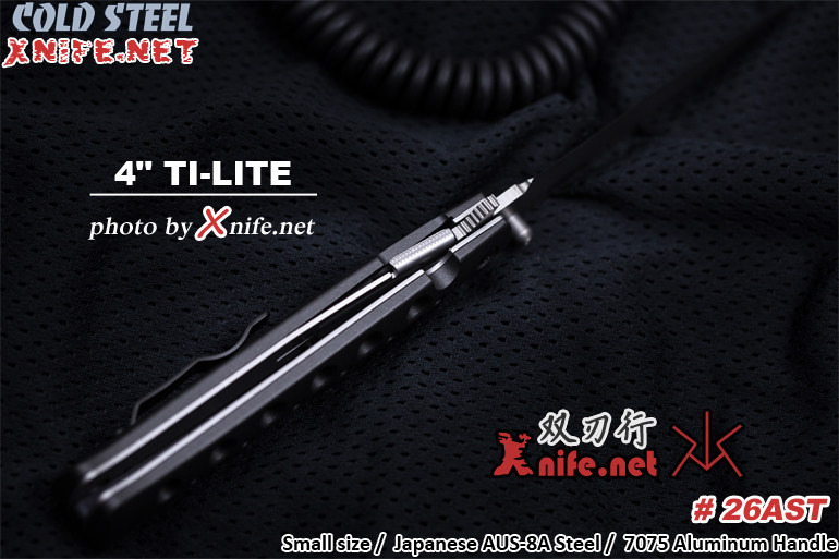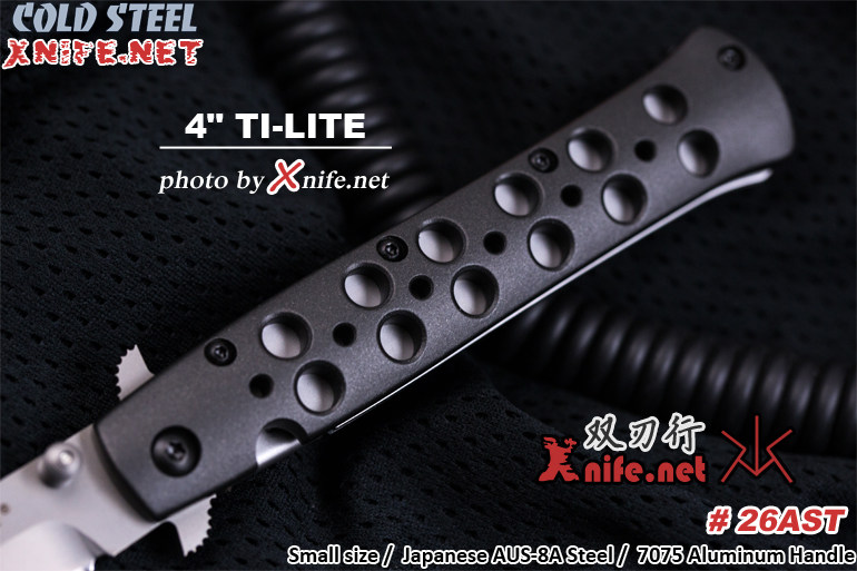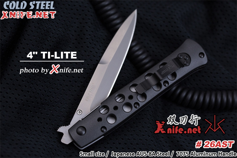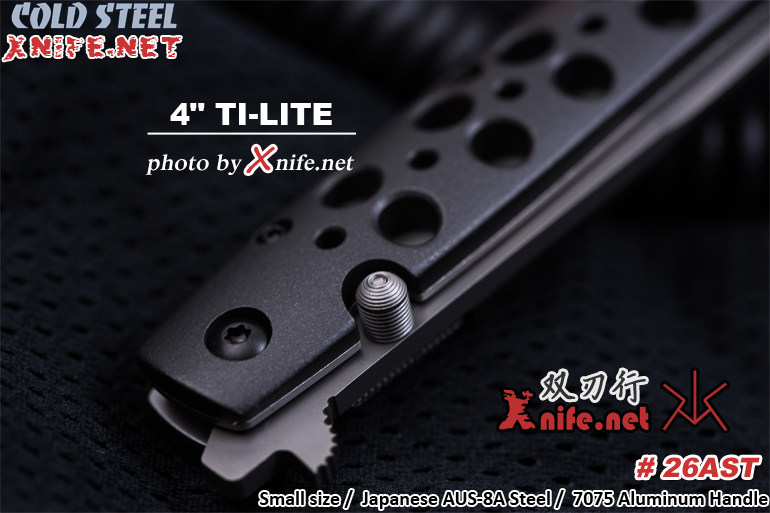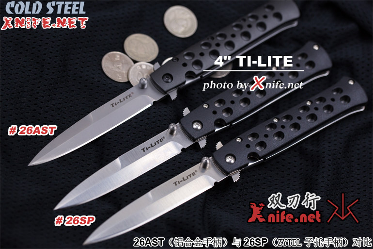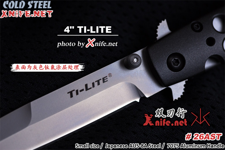 订制的刀款,尤其是以钛金属制造的,是那么地坚固耐用,重量又轻,看起来很棒。但是,钛金属的高价位,总是让人买不下手。很多收藏家都非常喜欢Cold Steel的Ti-Lite,也就是钛金属柄系列,但是又觉得太贵。Cold Steel公司听到消费者的心声,便以杜邦 Zytel 聚合物,内衬「0度C淬火 ( Sub Zero Quenched )」的AUS-8A不锈钢,来仿制原来Ti-Lite系列的刀柄外观。重量甚至比钛金属柄还轻,不仔细看,分辨不出来是钛金属、还是Zytel聚合物?但是价位,却明显地减了近七成。