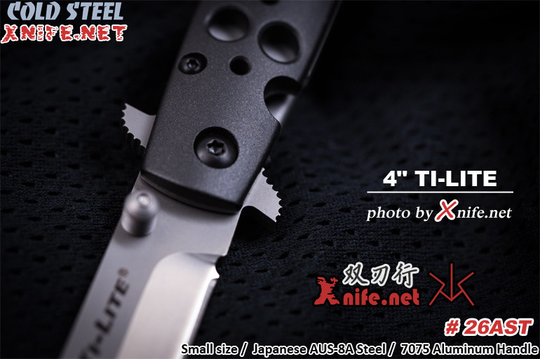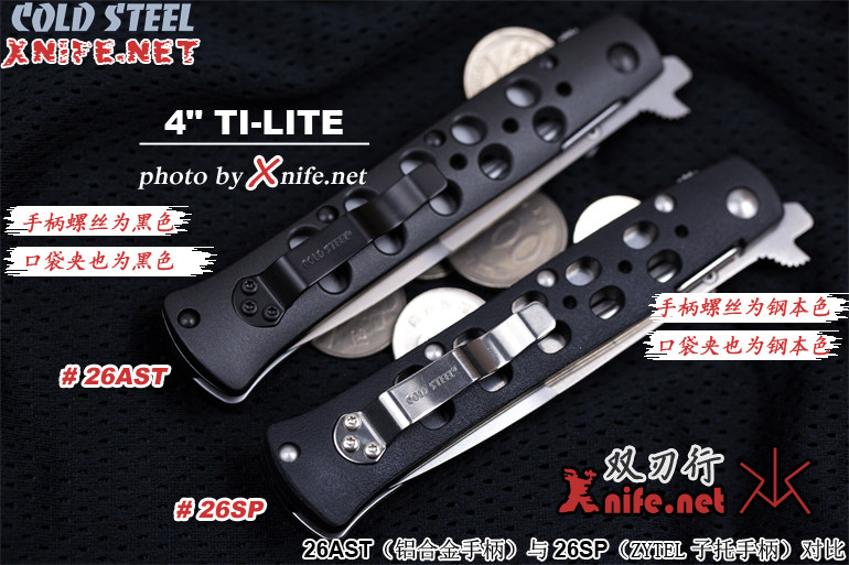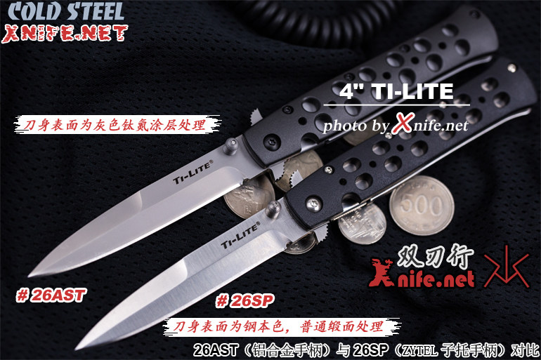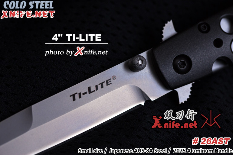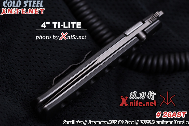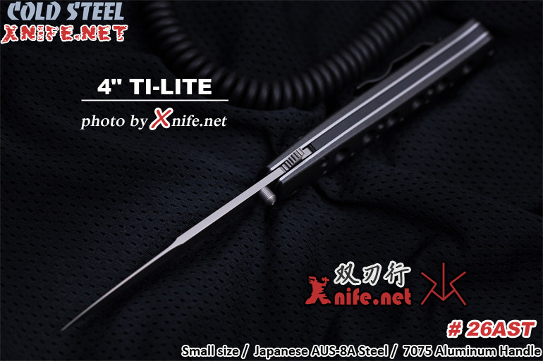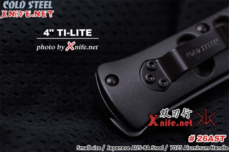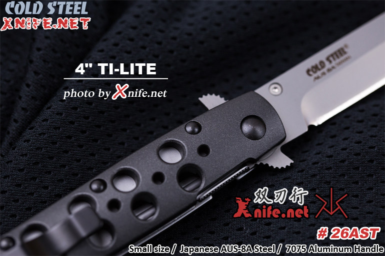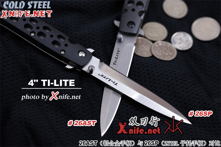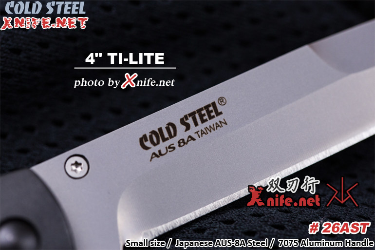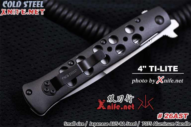 订制的刀款,尤其是以钛金属制造的,是那么地坚固耐用,重量又轻,看起来很棒。但是,钛金属的高价位,总是让人买不下手。很多收藏家都非常喜欢Cold Steel的Ti-Lite,也就是钛金属柄系列,但是又觉得太贵。Cold Steel公司听到消费者的心声,便以杜邦 Zytel 聚合物,内衬「0度C淬火 ( Sub Zero Quenched )」的AUS-8A不锈钢,来仿制原来Ti-Lite系列的刀柄外观。重量甚至比钛金属柄还轻,不仔细看,分辨不出来是钛金属、还是Zytel聚合物?但是价位,却明显地减了近七成。