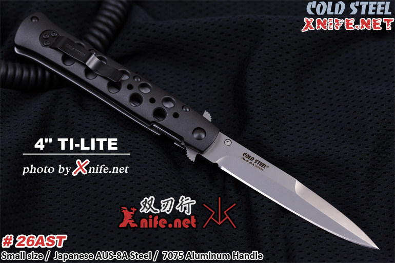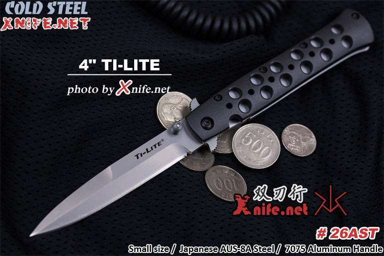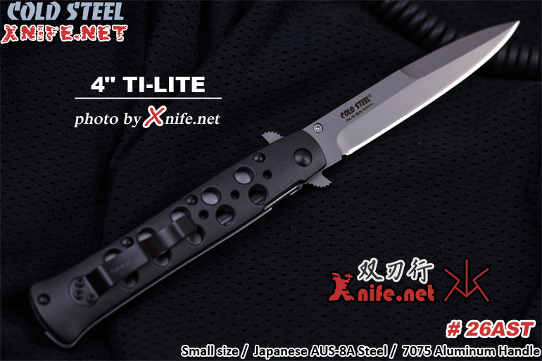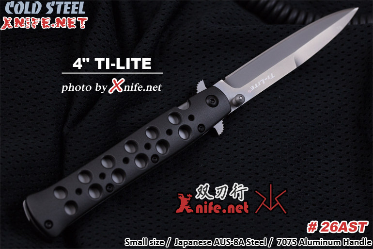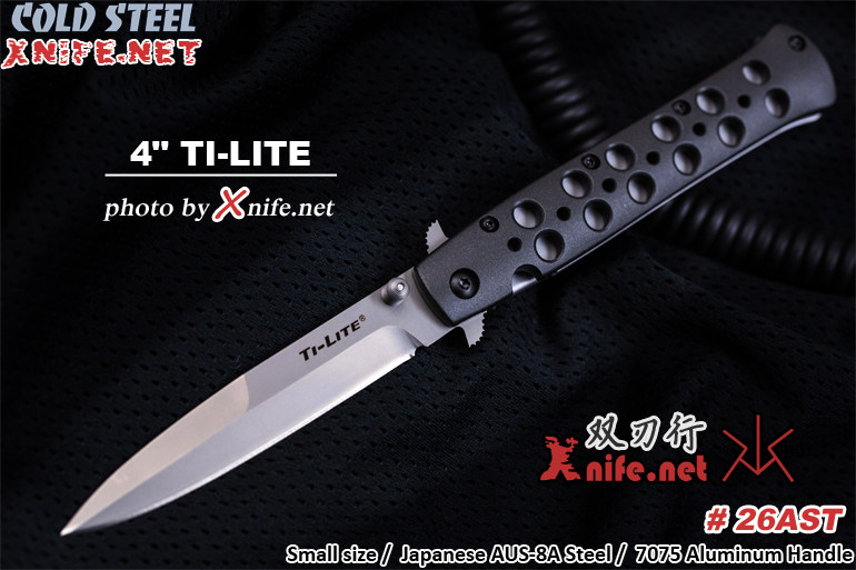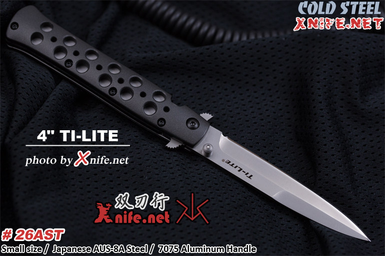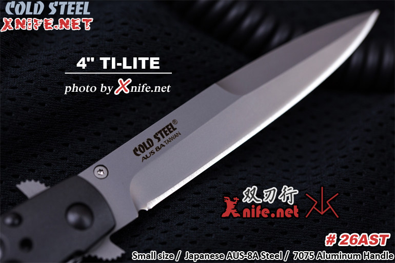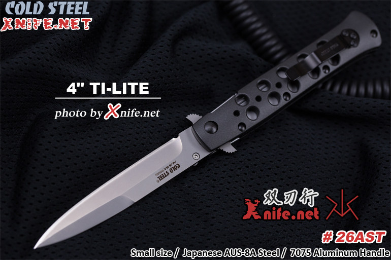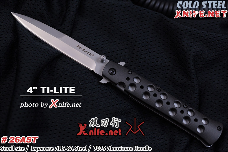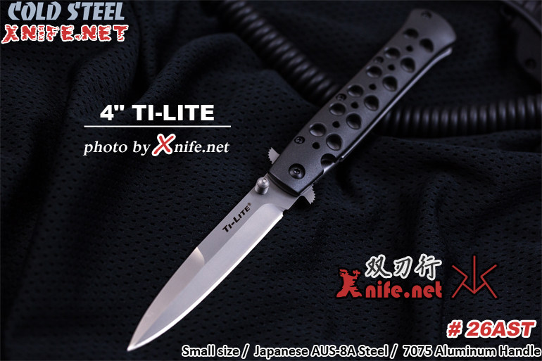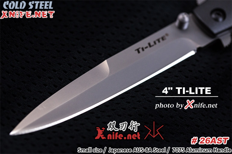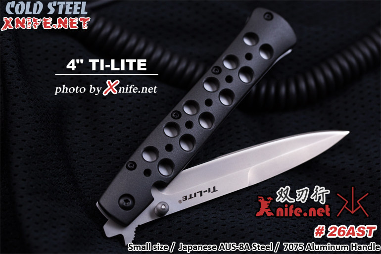 订制的刀款,尤其是以钛金属制造的,是那么地坚固耐用,重量又轻,看起来很棒。但是,钛金属的高价位,总是让人买不下手。很多收藏家都非常喜欢Cold Steel的Ti-Lite,也就是钛金属柄系列,但是又觉得太贵。Cold Steel公司听到消费者的心声,便以杜邦 Zytel 聚合物,内衬「0度C淬火 ( Sub Zero Quenched )」的AUS-8A不锈钢,来仿制原来Ti-Lite系列的刀柄外观。重量甚至比钛金属柄还轻,不仔细看,分辨不出来是钛金属、还是Zytel聚合物?但是价位,却明显地减了近七成。